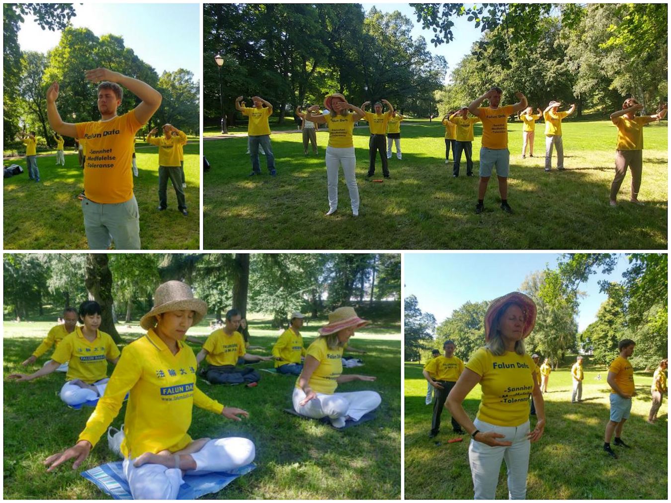 ![]() 图2:挪威法轮功学员在皇宫公园集体炼功,展示法轮功的祥和美好 |