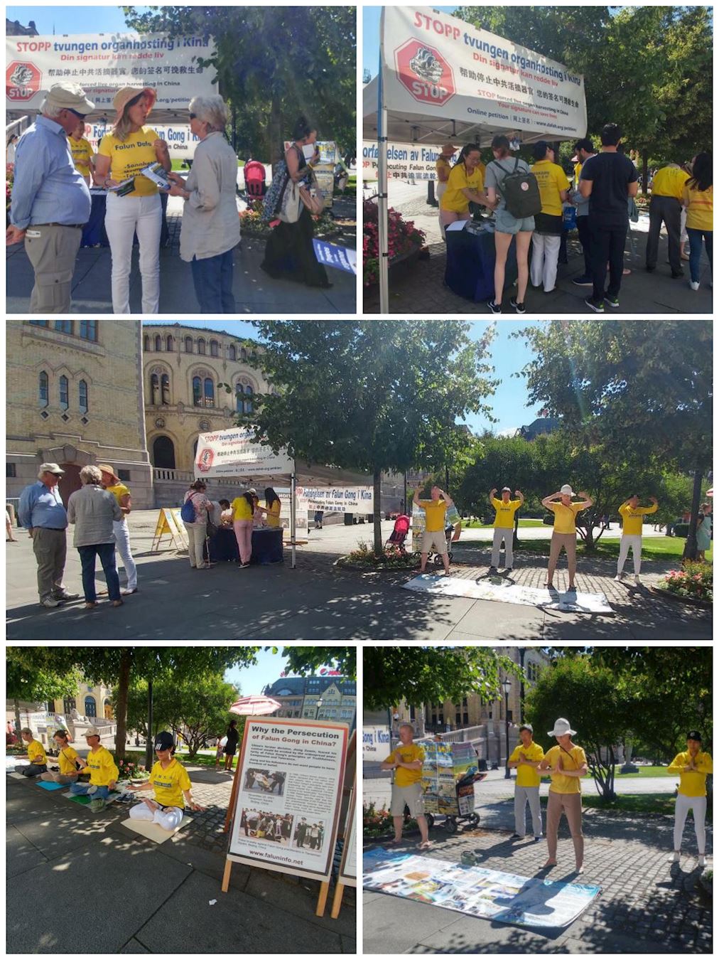 挪威国会大厦是挪威国会的办公场所,位于挪威市中心最主要的卡尔约翰大街旁。法轮功学员在这里摆设展位,向民众展示功法,并讲述法轮功迫害真相。