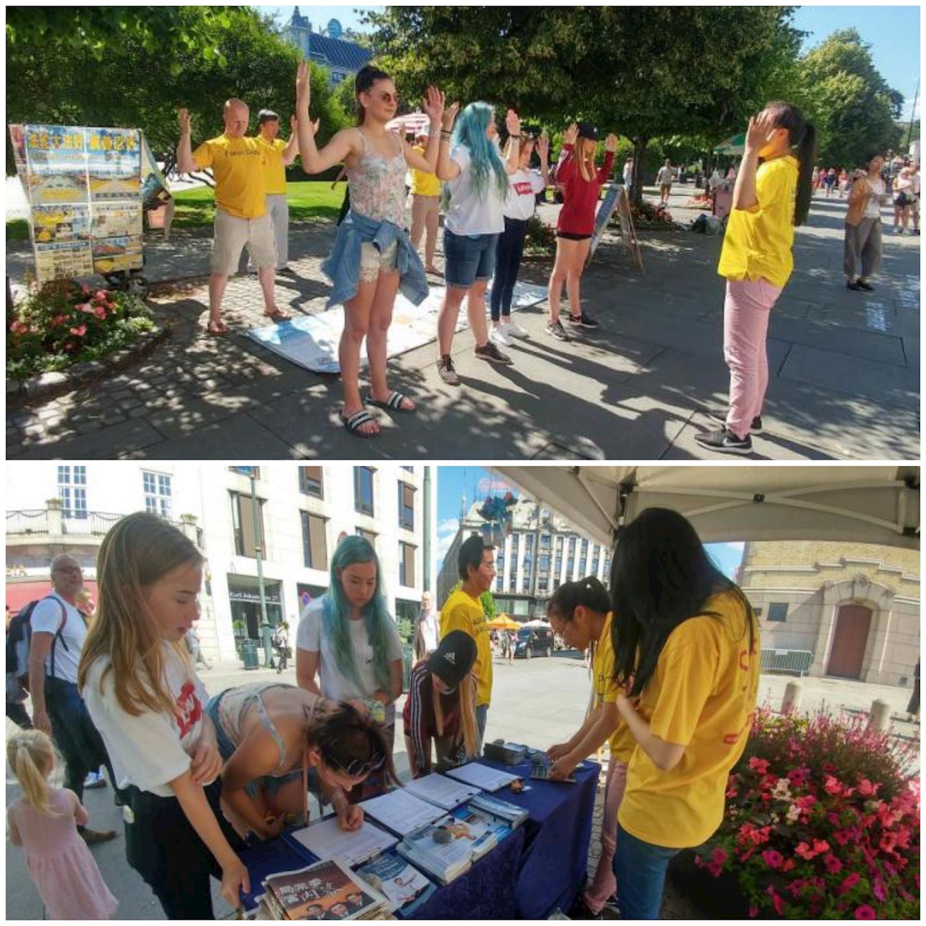 来自挪威南部城市萨普斯堡的四个学生假期来首都奥斯陆游玩,经过展位看到学员炼功很感兴趣,不由自主地跟着学炼起来。学员近而向她们讲述活摘真相。她们感到十分震惊,作为一个生长在西方自由民主国家的女孩,很难想象在中共独裁统治下会发生如此残暴的事情。