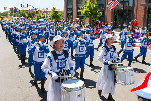 法轮功学员的游行方队由美西天国乐团、旌旗队、炼功队、腰鼓队、舞蹈队和花车组成。今年是腰鼓队第一次参加红木城游行。这次参加红木城游行的法轮功方阵是历年来最大的,气势磅礴。所到之处,人们禁不住鼓掌欢呼、为法轮功的队伍叫好。