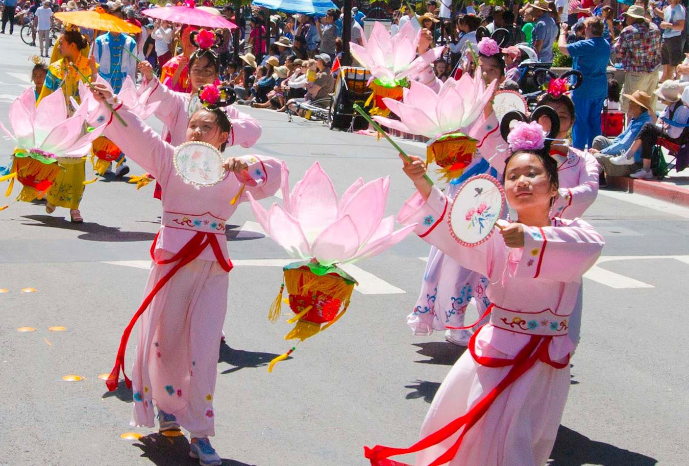 图19:在美国出生长大、自幼修炼法轮功的伍爱莲(左一)每年都来参加红木城国庆日游行,告诉民众:法轮大法好。