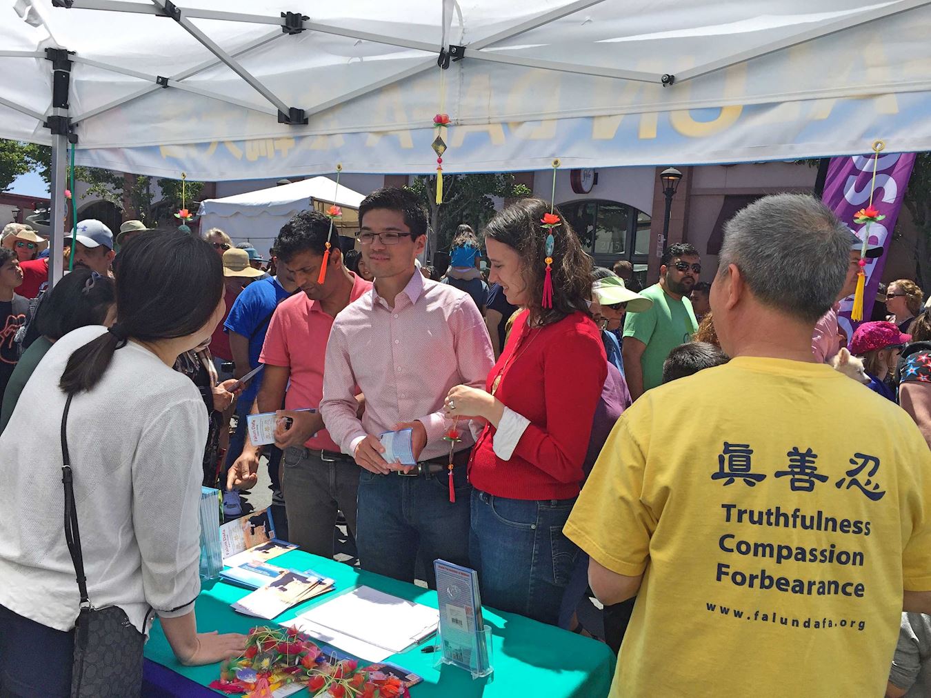 游行结束后贝弗利(Beverley)和先生布鲁斯(Bruce)径直找到法轮功的摊位,她兴奋的说:“在游行中看到法轮功学员,我就过来找他们了,果真在这里找到了。”当被问到为什么要找法轮功时,她说:“看到他们时,就有一种感觉:要去找他们。于是就找到这里了。”