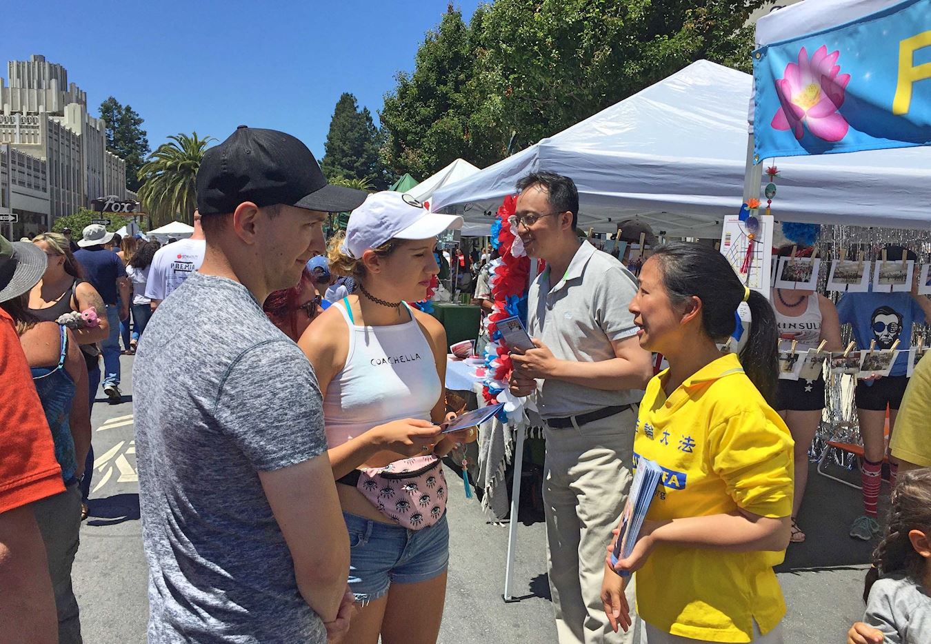 湾区居民Cynthia 和Ed跟随着“法轮大法好”的音乐和拍子,太太则模仿法轮功学员的炼功动作,Ed不断说:“太美了,太美了。” 太太辛西娅开心的说:“看着他们亮丽的黄色的服装,就让人感到很舒服,很美好。”当被问到在模仿法轮功学员的炼功动作是什么感觉时,她说:“感觉非常平和与放松,感觉很好。”