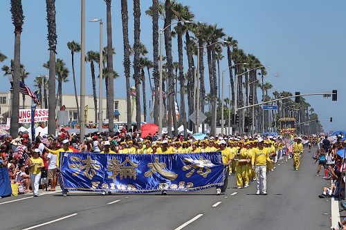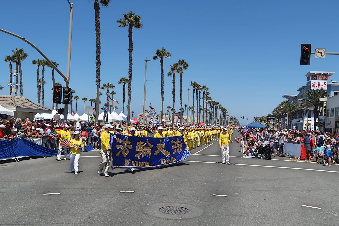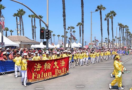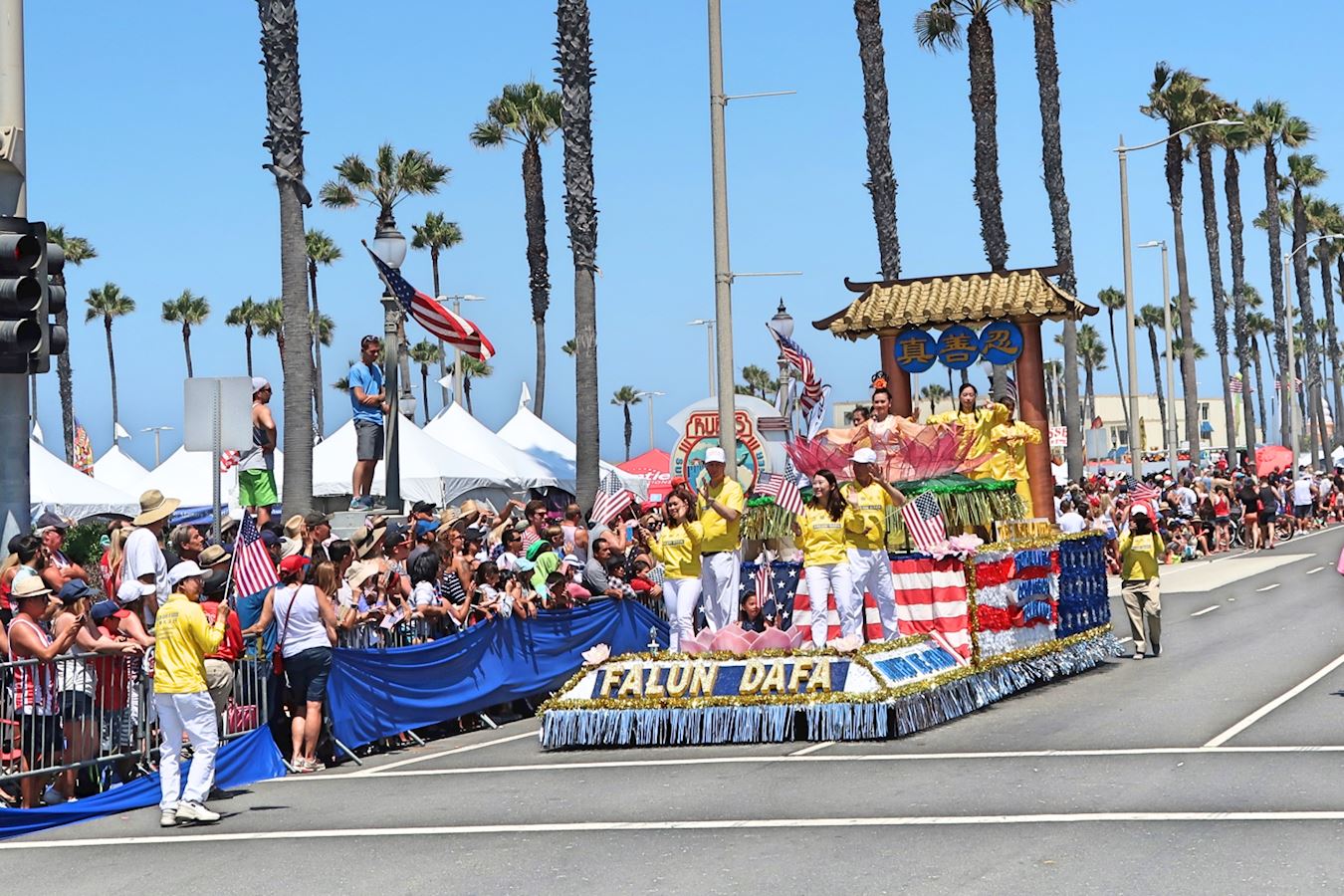 【明慧网二零一七年七月九日】二零一七年七月四日是美国的第二百四十一个生日,当天,美国西海岸最大规模的国庆游行在风景如画的南加州杭庭顿海滩市(Huntington Beach)举行。这个国庆游行由行军乐队、老式汽车队、马队、名人,军车和军人队伍、童子军、荣誉守卫、啦啦队、以及来自社区的团体队伍等,超过二百五十队伍组成,法轮功团体是其中之一。该游行由当地多个主流电视台或现场直播、或转播,估计有数十万观众观看。在这次游行中,法轮大法队伍的花车再次获得第二名。