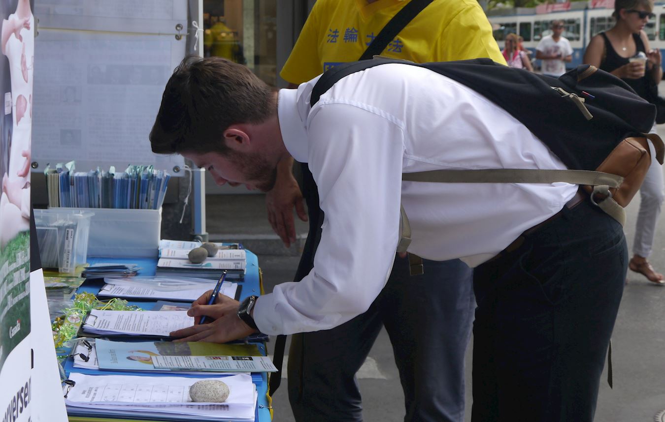 在苏黎世大学政治经济系就读的凯撒(Caesar)在路过时主动停下了解更多的讯息。他认为中共活摘器官的罪行:“非常清楚,对我而言是完全不能容忍的。征签让人来关注这件事,是一件好事,我支持征签。”他希望通过自己的签名“可以让更多人来关注这一切,在联合国也能对此展开讨论,能制止这场迫害。”