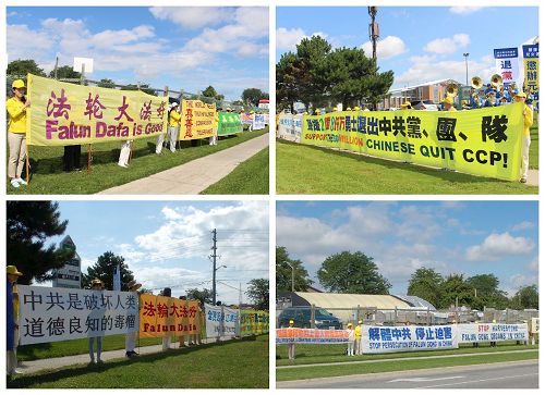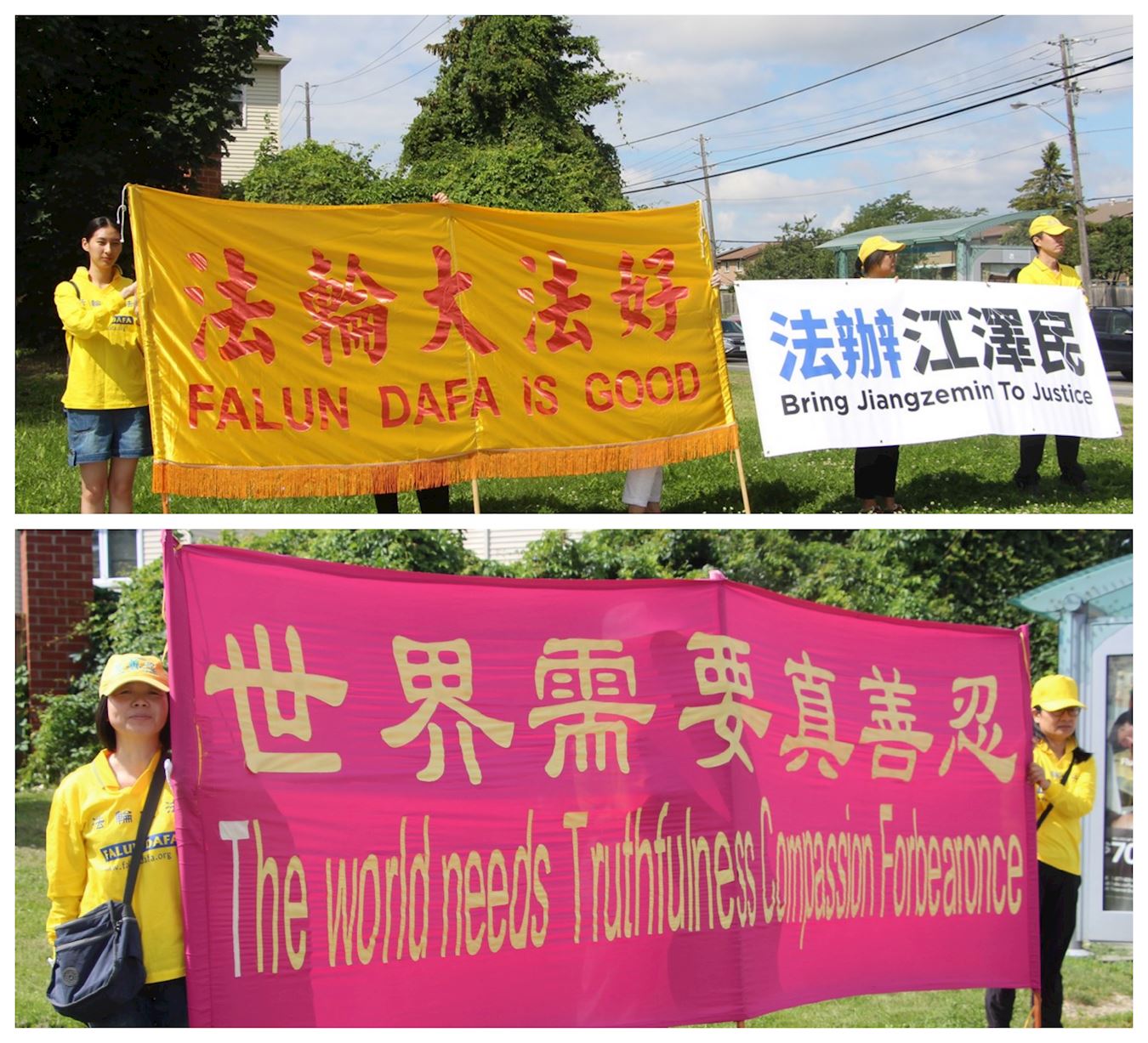 二零一七年八月十二日上午,多伦多部份法轮功学员在这繁忙的太古广场前的十字路口再次筑起了真相长城,天国乐团也到现场演奏,声援二亿八千万人退出中共,学员给民众讲法轮功真相,让更多了解真相的人作出“三退”(退出中共党、团、队)的选择。在每分钟过往超过七十辆车的繁忙十字路口,天国乐团的演奏和醒目的横幅吸引了车里的乘客和路人,有鸣笛和竖起大拇指表示支持的;有华人做现场三退的,有西人拍照表示支持的。