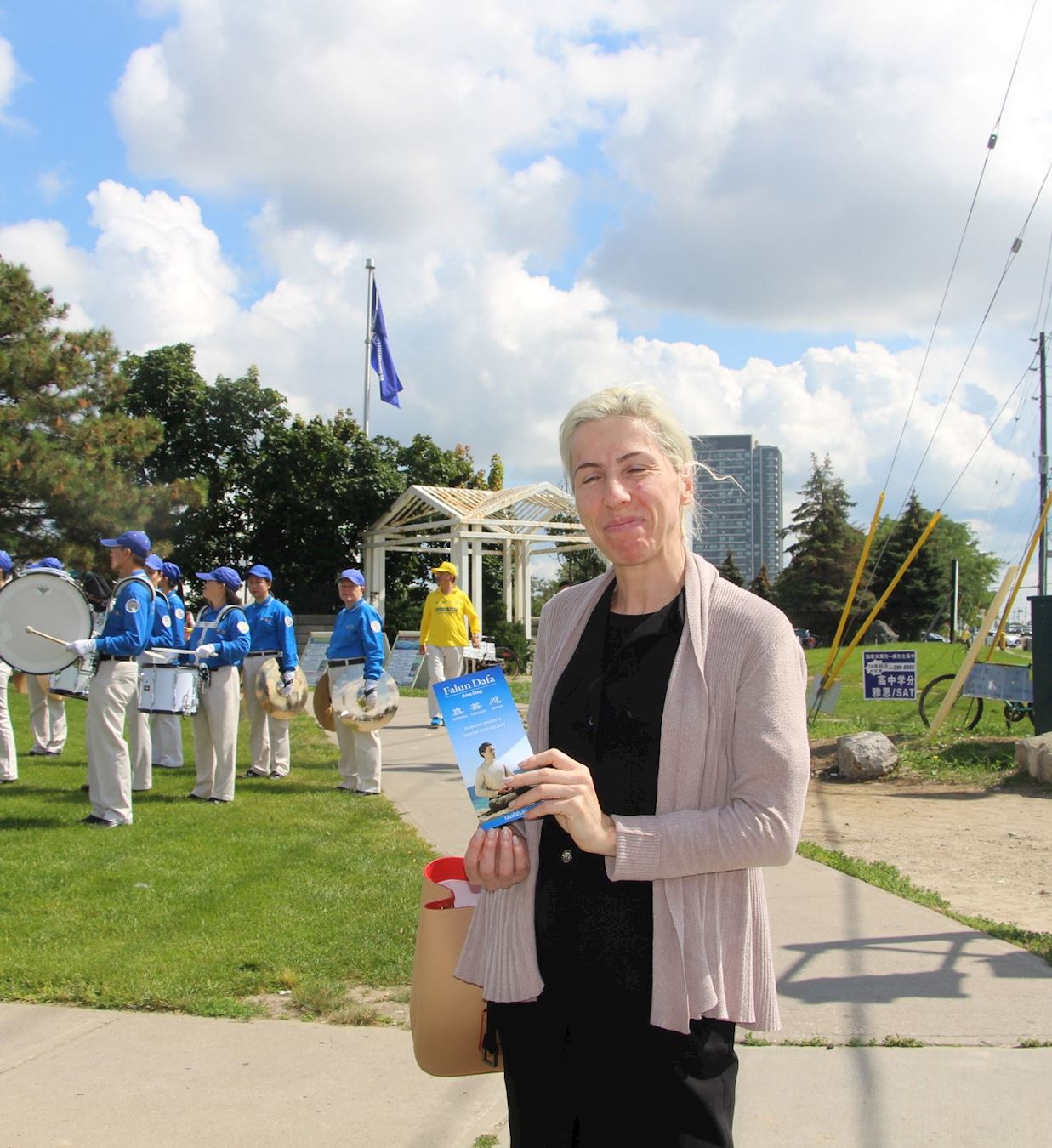 今年六十二岁来自越南的法轮功学员Phuong,移民加拿大已经十七年。她二零一二年回越南探亲时,刚修炼法轮功六个月的妹夫给她介绍了法轮功,她就开始走入了大法修炼。回到多伦多后她找到了当地学员,走入了讲真相的行列,她每个周末都到太古广场这个景点讲真相,把她的受益的故事讲给人们。