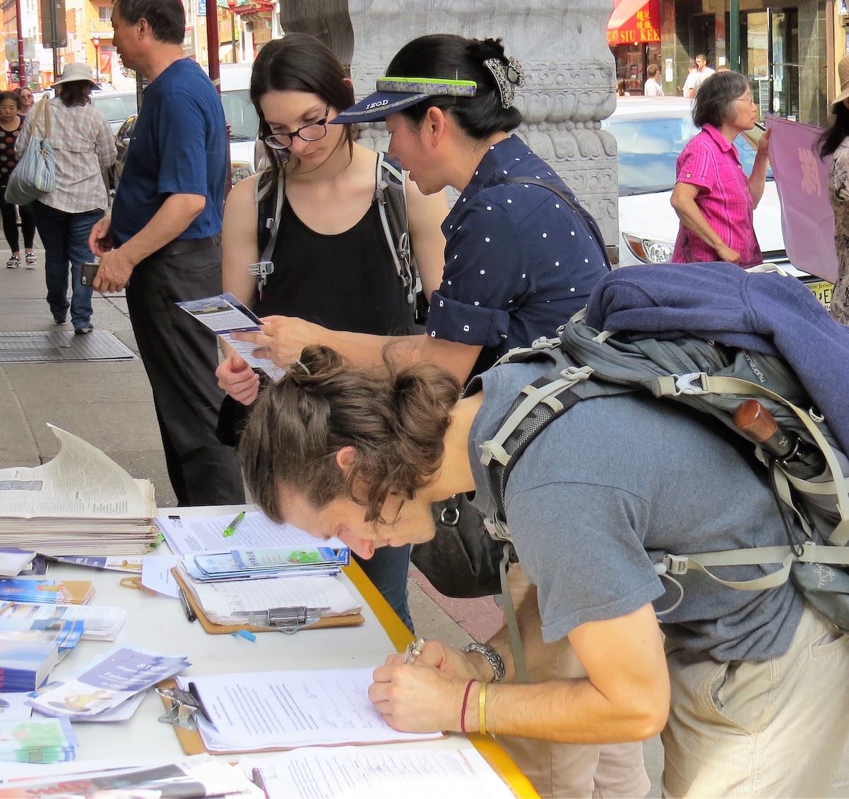 '图7~14:行人们驻足和学员交谈,并签名支持法轮功学员。'