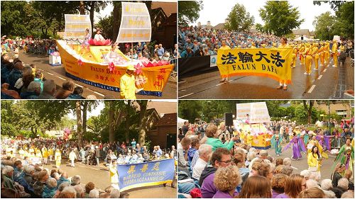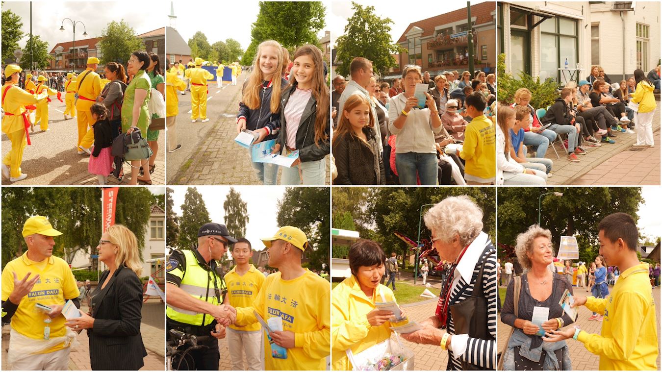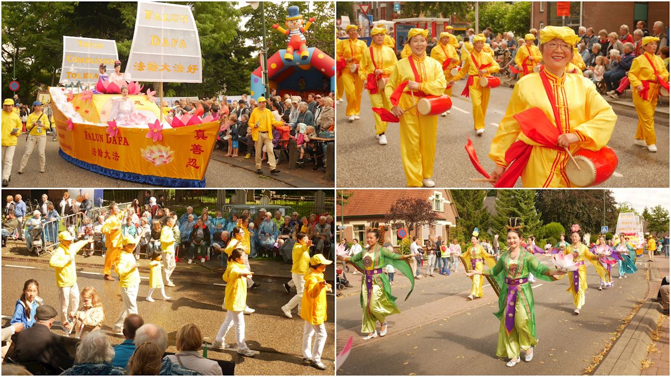 莱尔斯姆(leersum)小镇不大,但是源于荷兰女王日的花车游行今年已是第六十五届,是荷兰中部有名的艺术节,慕名而来者需要购票入镇观看。该地区不同市镇民众,用最美丽的鲜花装扮本区特色花车,各种造型争奇斗艳。传统的服饰,浓厚的文化艺术色彩,喜悦洋溢在参与者的笑脸上,整个游行一派欢乐景象。法轮功学员的队伍别具一格,在其中尤为引人瞩目。队伍由四部份组成,法轮功功法展示队、金色中式套装腰鼓队、手持莲花仙女队、以及金色法船造型的花车。