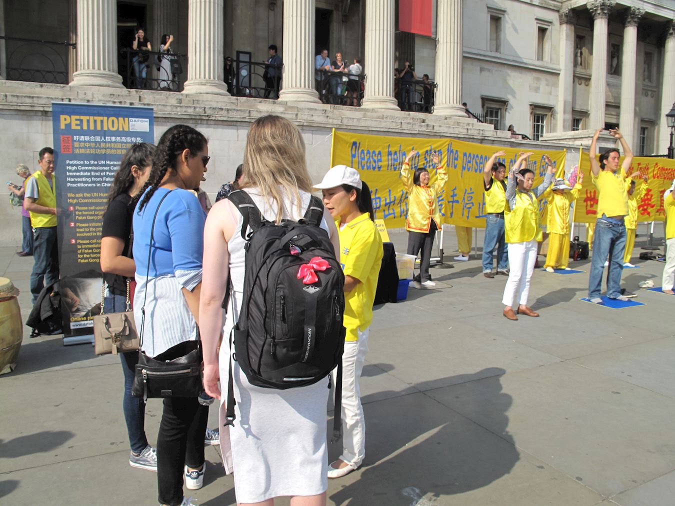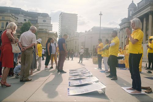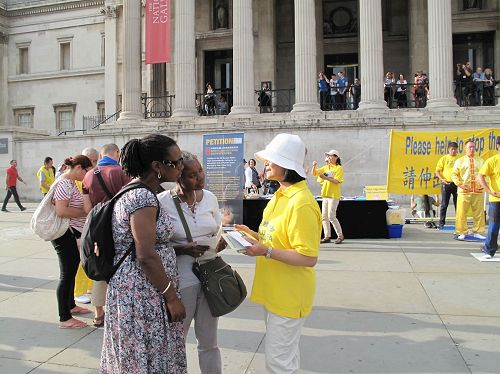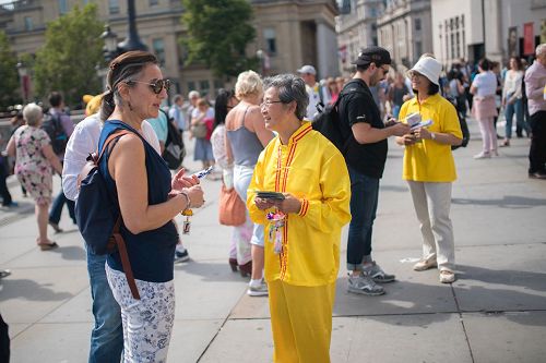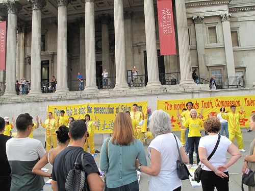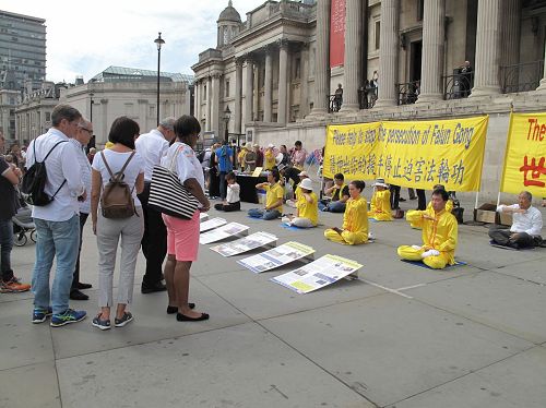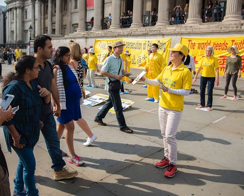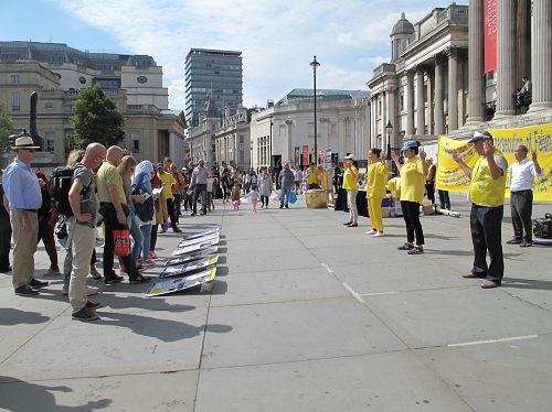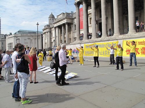 当天,英国法轮功学员又一次来到特拉法加广场,传播法轮功真相,他们打出两个巨大的真相横幅“世界需要真善忍”和“请伸出你的援手停止迫害法轮功”,把介绍法轮功基本真相的展板摆在场地前沿,其间一组身着金黄色服装的法轮功学员伴着宁静祥和的炼功音乐展示法轮功五套功法,在场地两侧各设一个信息台,并在旁边竖起反“活摘”征签展板,多位法轮功学员在人群中发传单、和民众交谈、征签。法轮功学员传递的真相信息清晰明了,而穿插进行的法轮功学员的舞龙表演引来众人目光,当天,在位于伦敦市中心的这个著名广场,法轮功真相成为人们关注焦点。
