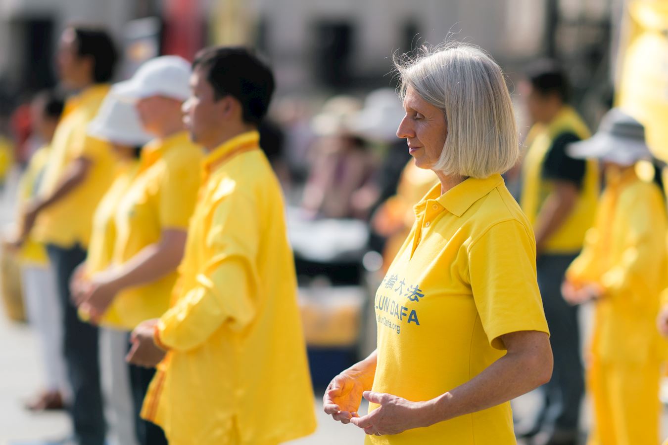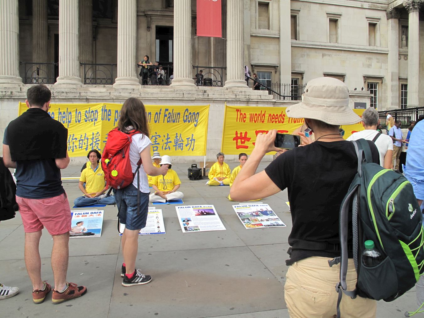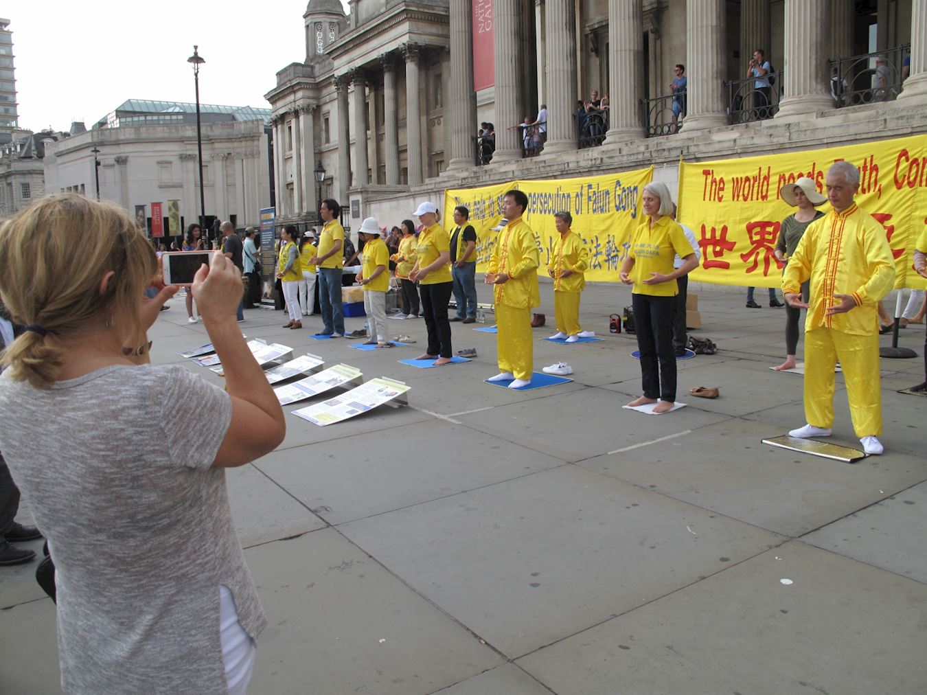 当天,英国法轮功学员又一次来到特拉法加广场,传播法轮功真相,他们打出两个巨大的真相横幅“世界需要真善忍”和“请伸出你的援手停止迫害法轮功”,把介绍法轮功基本真相的展板摆在场地前沿,其间一组身着金黄色服装的法轮功学员伴着宁静祥和的炼功音乐展示法轮功五套功法,在场地两侧各设一个信息台,并在旁边竖起反“活摘”征签展板,多位法轮功学员在人群中发传单、和民众交谈、征签。法轮功学员传递的真相信息清晰明了,而穿插进行的法轮功学员的舞龙表演引来众人目光,当天,在位于伦敦市中心的这个著名广场,法轮功真相成为人们关注焦点。