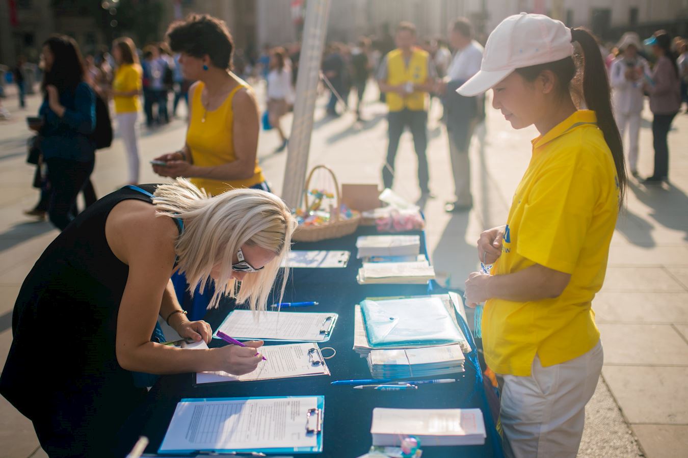 一位来自德国的女士,第一次听说法轮功,用手机认真地将法轮功学员的集体炼功场面录下来了,听一位法轮功学员讲真相后立即去签字支持法轮功反迫害,她对站在信息台前的学员说:“每个人都该拥有信仰自由、能够为自己做选择。这么平和的功法,这么多人在炼,一定是对人是有益的。”