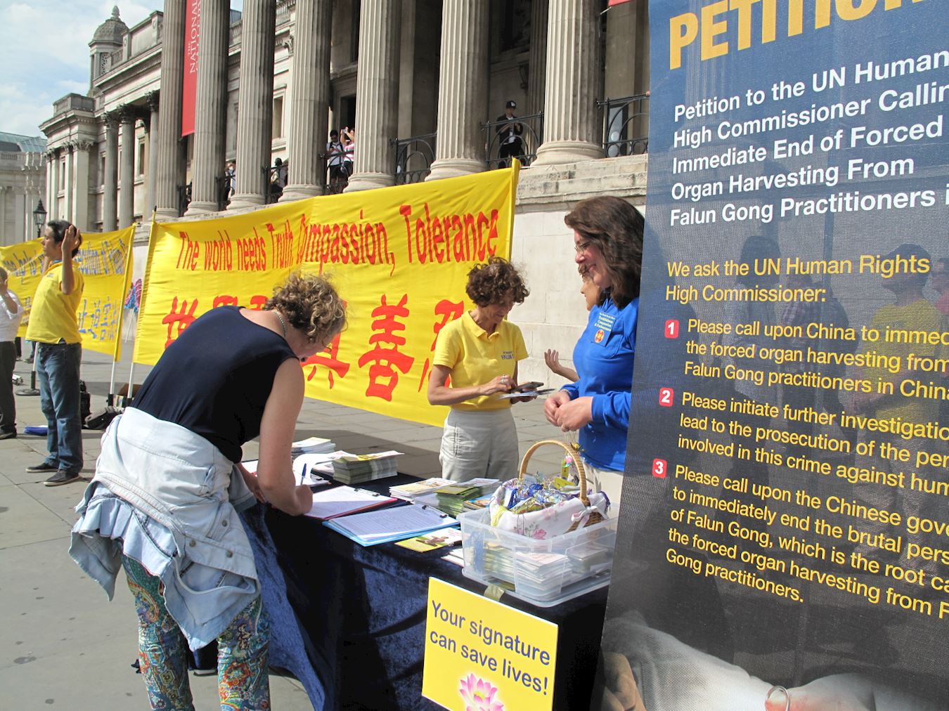 两位去国家美术馆(The National Gallery)参观的伦敦女孩被法轮功学员的讲真相场面所吸引,直接奔向信息台向一位西人法轮功学员了解真相,她们对中共对法轮功学员的残酷迫害、特别是中共活摘法轮功学员器官的罪行感到震惊,立即在征签表上签名,并感谢法轮功学员告诉人们真相,说:“谢谢你告诉我们这些,你们在这里做这个(传播真相)太好了!”