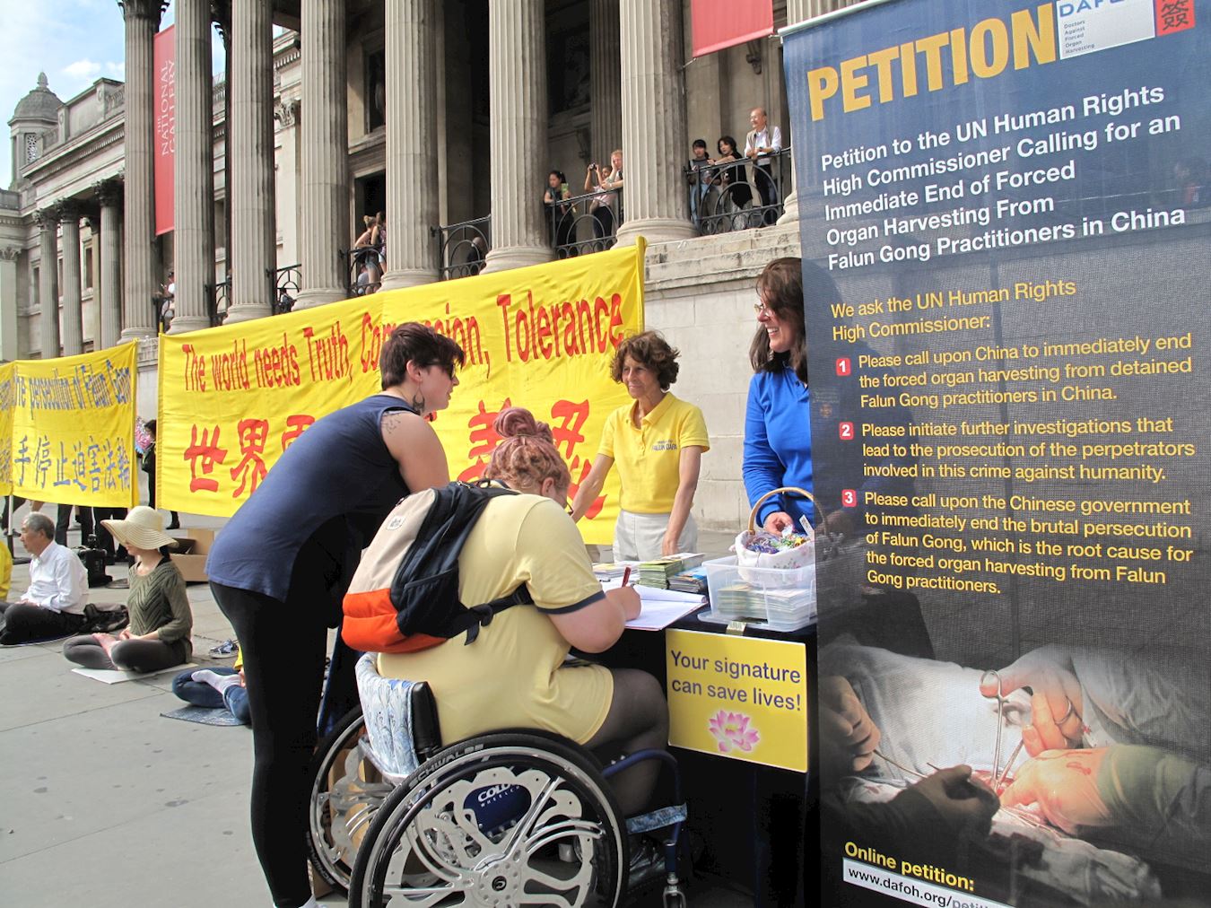 一个坐在轮椅上的伦敦女士和朋友经过特拉法加广场,对着法轮功学员的活动场景看了一会后径直到信息台前签名支持法轮功反迫害,她说自己以前在附近的圣马丁广场遇到过法轮功学员,已经了解真相了,看到法轮功学员不断努力让更多人听到真相,她非常愿意尽一臂之力,因为对法轮功的迫害“必须立即停止”。