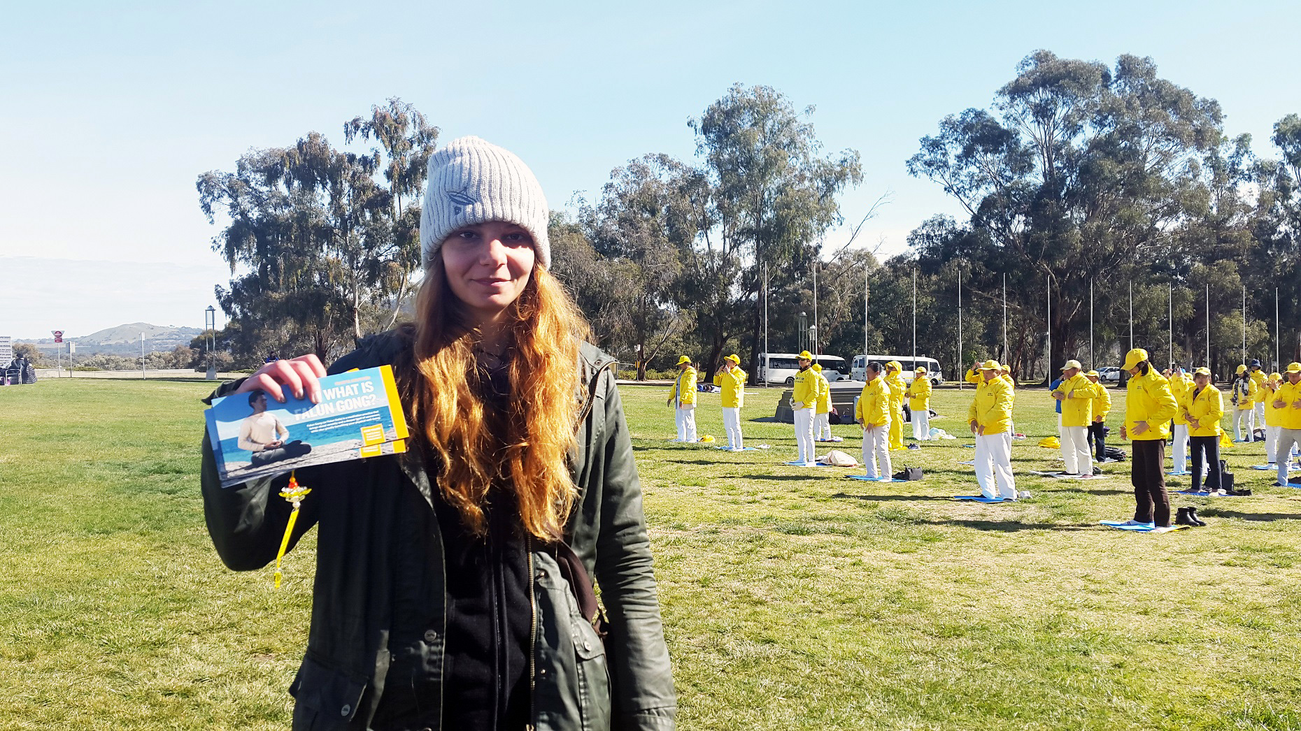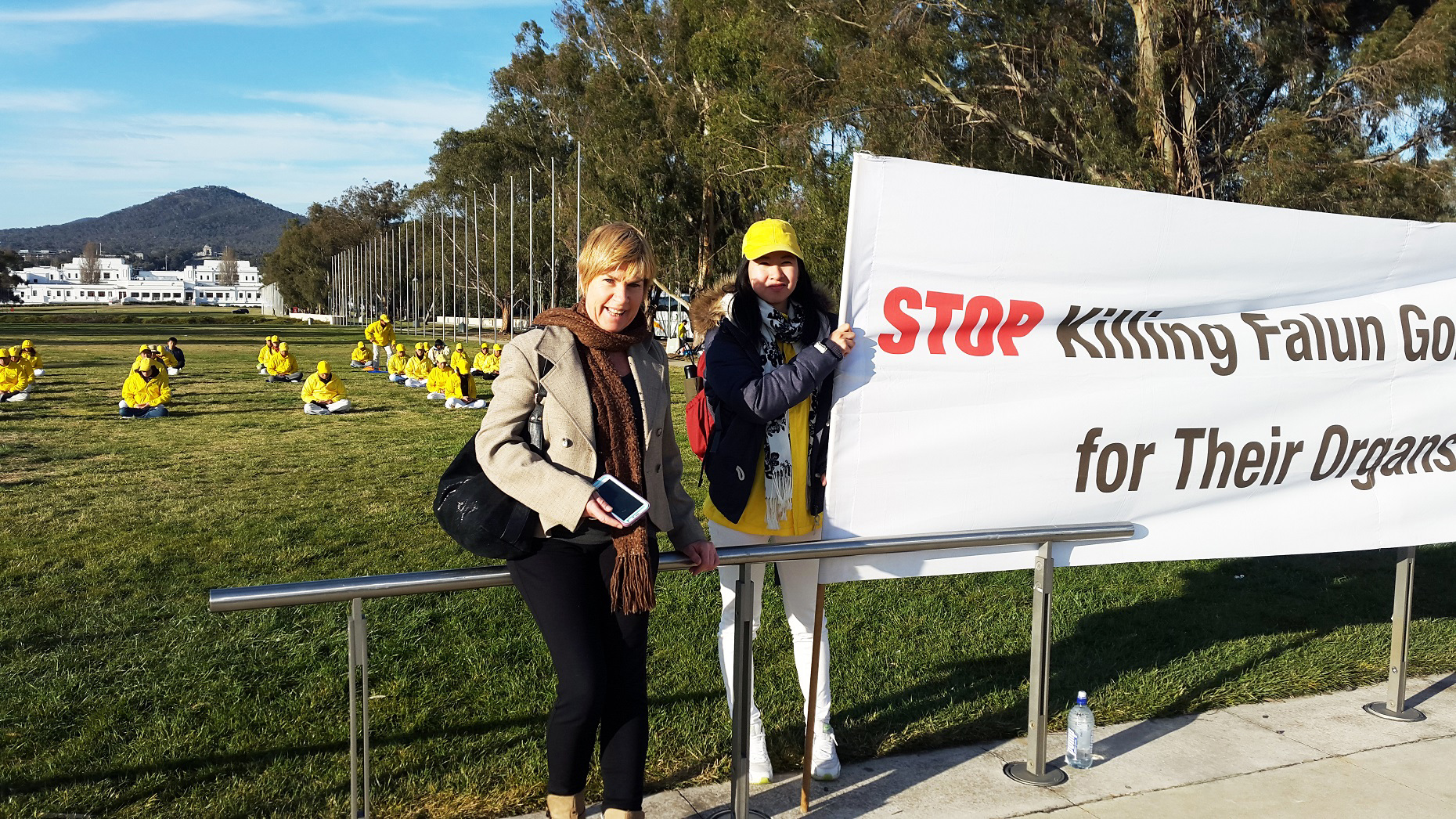 从德国来澳洲旅游的尼克·特克(Nicky Turk)女士,被住在堪培拉的朋友介绍来观看法轮功正在国会大厦门口抗议中共迫害法轮功以及活摘法轮功学员器官的严重罪行的活动。