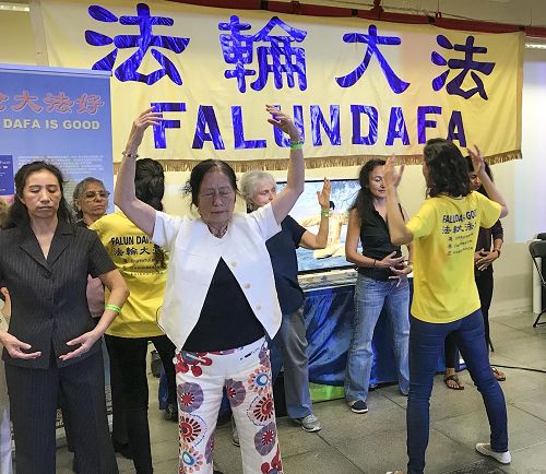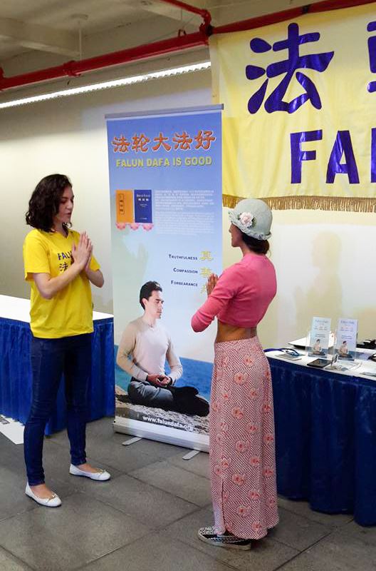 一位男士告诉学员他以前就听说过法轮功,并一直好奇想尝试学炼都没有成功,今天他特别高兴终于能够学炼法轮功功法了。这时旁边一位客人问学员纽约市哪里可以学功,在学员回答问题之前,这位男士已经告诉这位客人哪里他可以学功甚至学员们在那炼功的时间。
