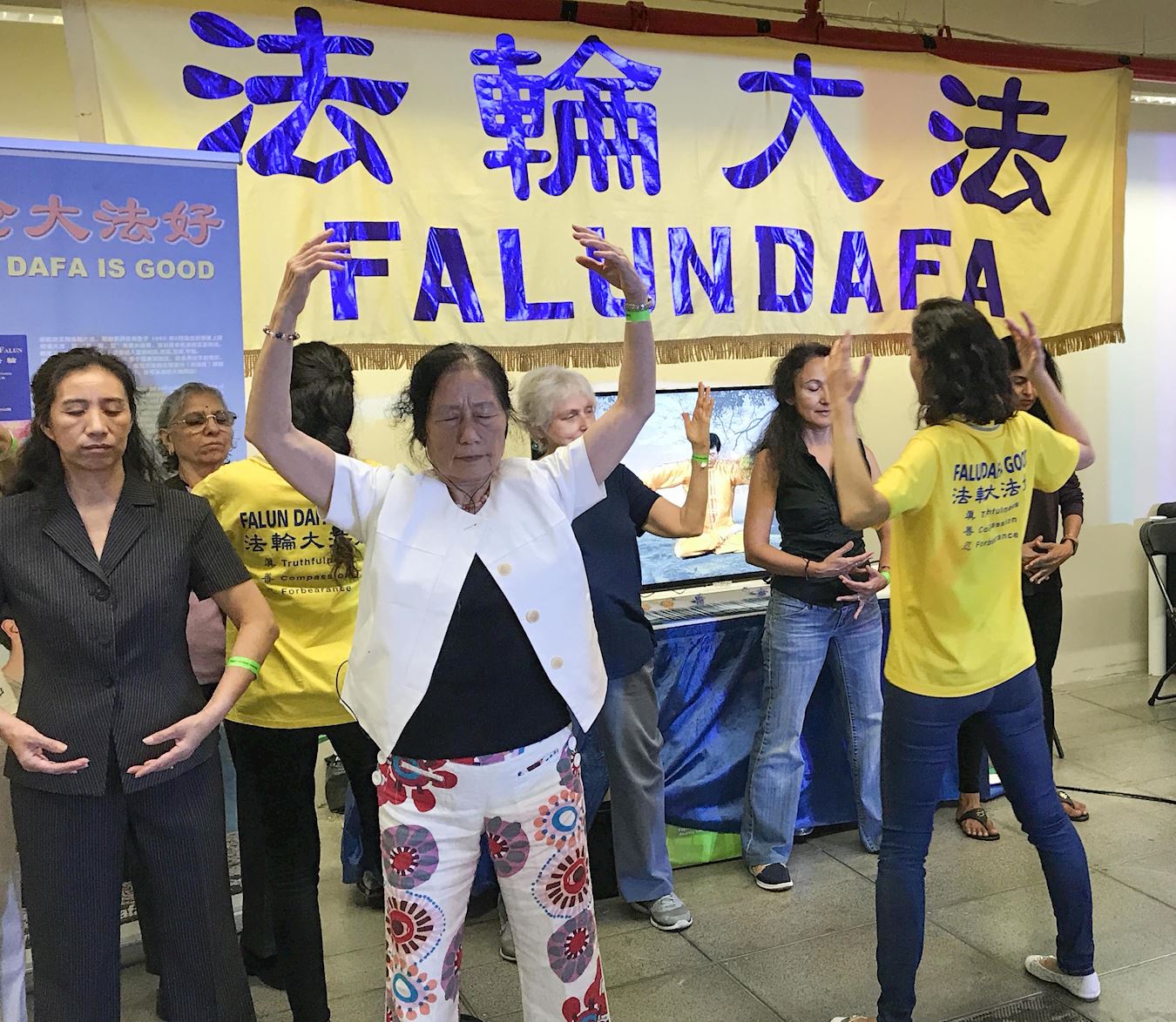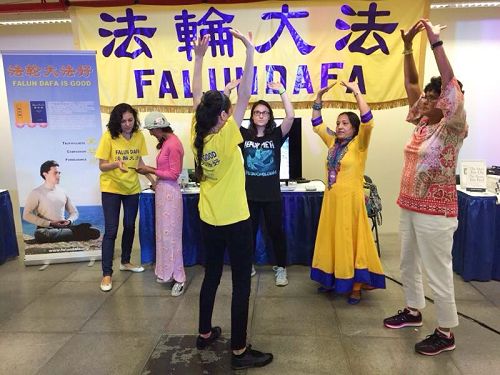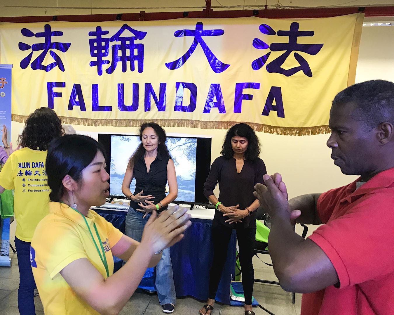 法轮功的展位在中心演讲台的侧面,展位上的大横幅和朝气蓬勃的学员吸引了很多人驻足询问。学员们开始做功法演示,人们一个接一个的过来要求学功。展位前的空间已经不够用了。很快学员们开发了边上的空地继续教功。