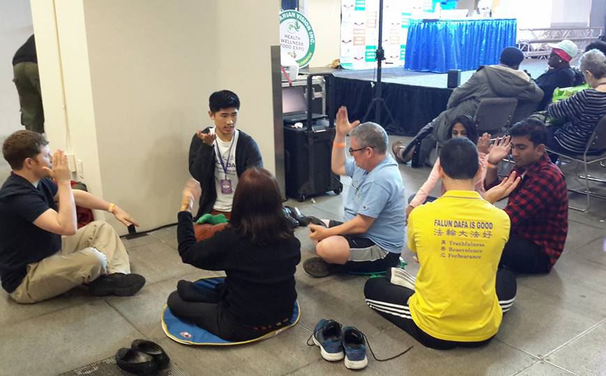 当学员们演示第五套功法“神通加持法”时,吸引了更多的人观看要求学功。人们纷纷感叹“他们看起来如此平静”、“这里的能量真是太好了。”甚至主办者也过来为他们摄像,希望能作为素食博览会受欢迎的宣传镜头。