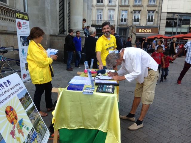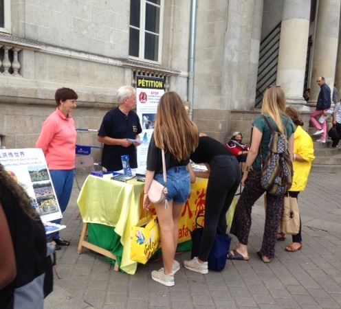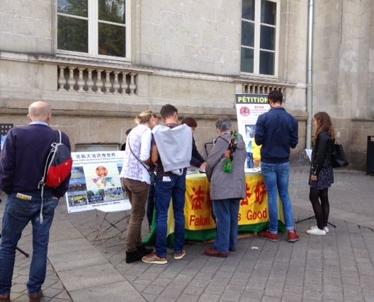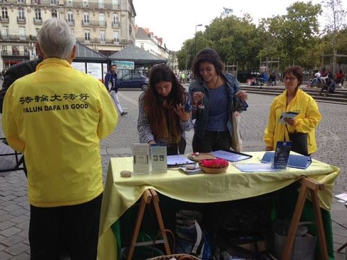 【明慧网二零一七年九月十九日】二零一七年九月二日和九日,法国南部法轮功学员在南特市(Nantes)中心的商业广场进行了介绍法轮功的活动。时值开学期间,成群结队的青年学生路过法轮功学员的活动地点,他们对发生在中国的事很感兴趣。当人们得知在中国修炼法轮功会遭到迫害,甚至被强行摘取器官,无不震惊。有人说:“我还以为是过去的事情呢。”“二战已经过去很久了,好像是过去很久以前的事情刚刚浮出水面。”