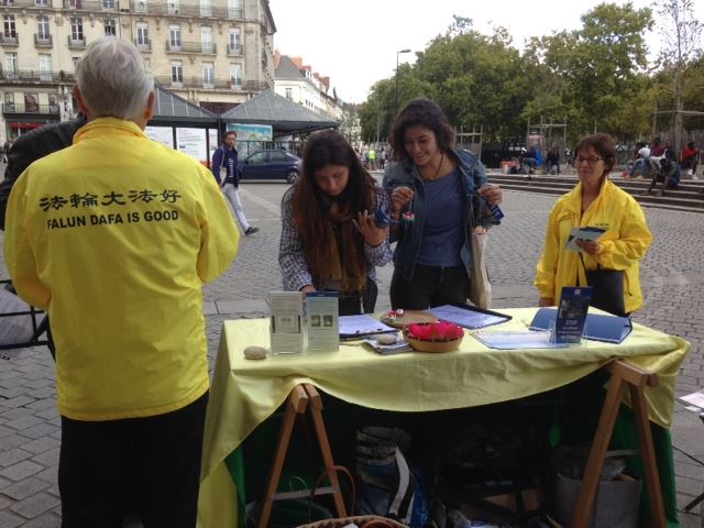 一些医学院的学生,还有医生,被中共迫害好人并活摘器官牟取暴利的罪行震惊。路易丝是年轻学生,她说:“我以为媒体知道这个迫害,我不理解为什么在中国人们不能自由地修炼法轮功。”在南特医院移植科工作的护士女士,对中共的这一反人类罪行感到非常震惊。她对法轮功修炼功法很有兴趣。第二天星期天的早上,她冒雨走了很远的路,来到了炼功点学功,她很高兴与法轮功学员一起炼功,感觉很好,并表示还会再来。