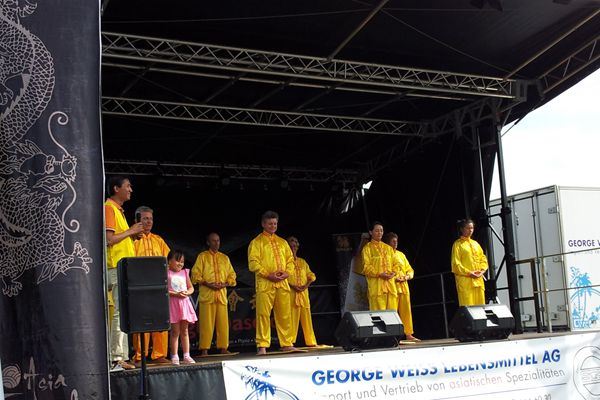 在亚洲节上,法轮功学员们还在展会中央舞台上展示了五套功法,同时讲解法轮功是由李洪志先生传出的佛家上乘修炼大法;世界各地有很多自发的炼功点,在伯尔尼也有;法轮功教人修心向善、做好人,并且祛病健身有奇效,为无数人带来了健康的身心。在法轮功学员们演示功法时,发生了一个有意思的小插曲:一名亚洲小女孩被深深的吸引,自己走上台来,一丝不茍地学炼起功来。舞台下观众都鼓掌表示欢迎和感谢。