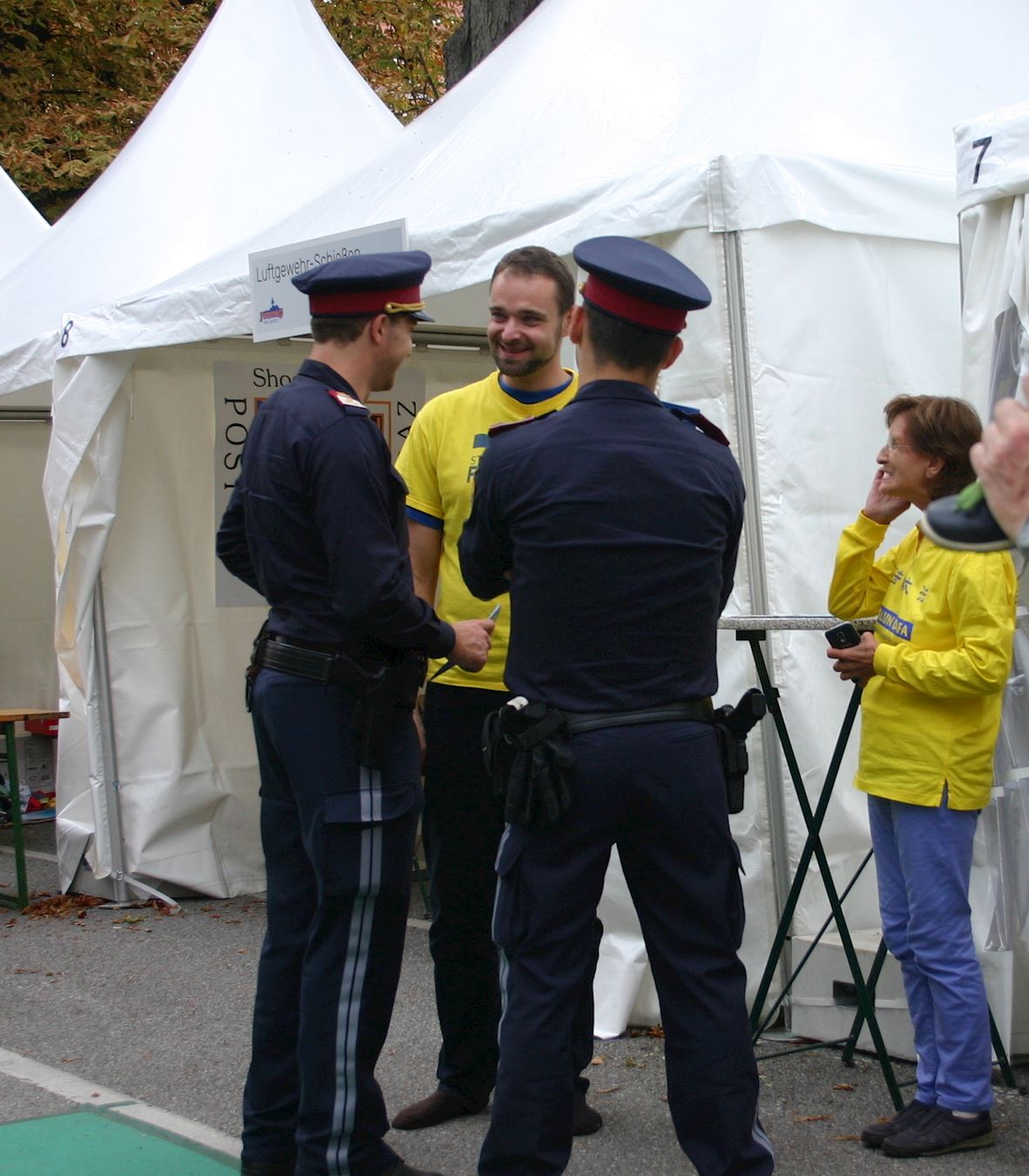 ![]() 图7~8:西人法轮功学员向执勤警察介绍法轮功 |