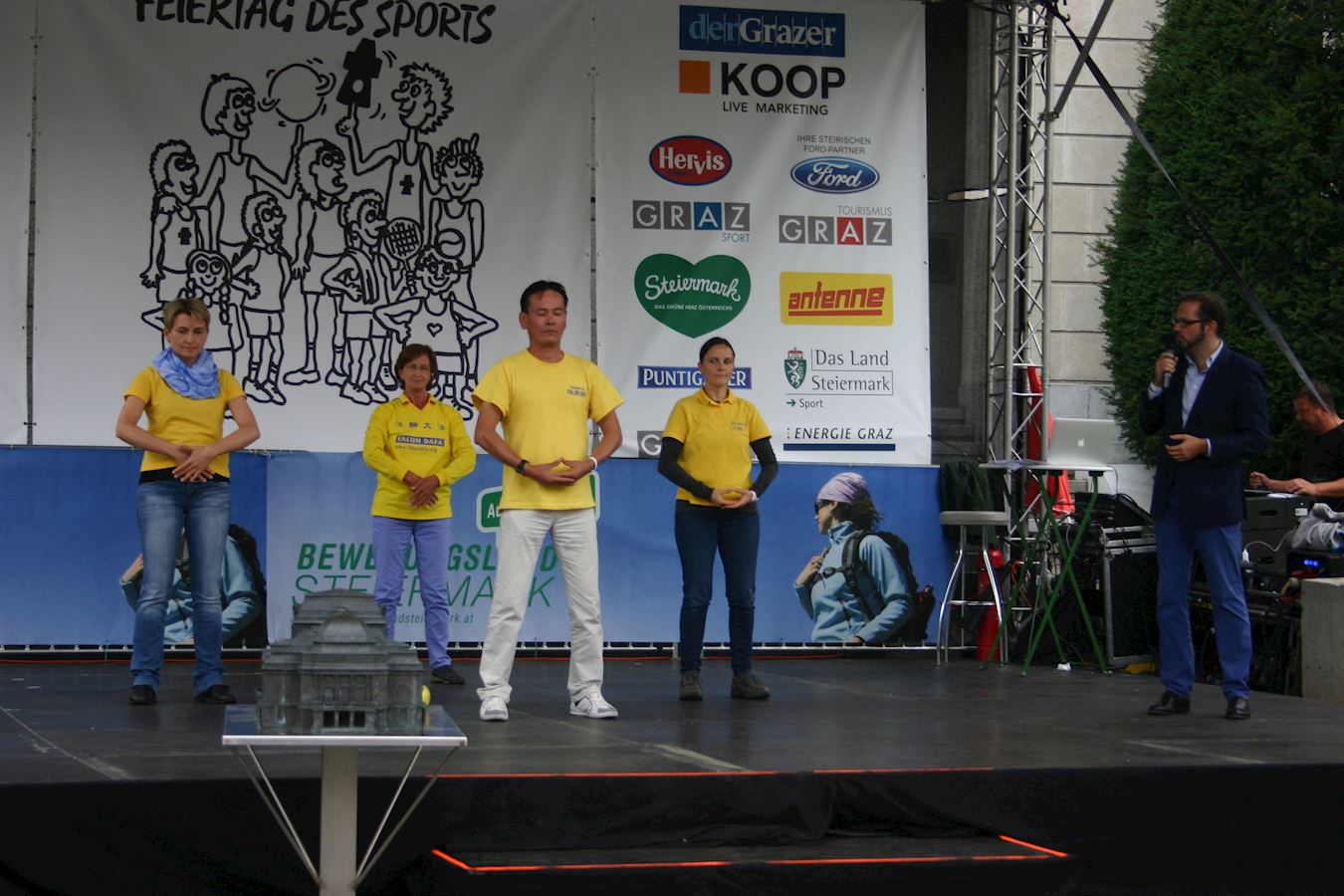 一位女士告诉法轮功学员,她做很多的运动。但是越来越感觉到压力和累。她正在寻找一个能让她静下来并能充满能量的方法。法轮功学员玛利亚跟她讲解了关于运动和气功的关系。那位女士听了解后,询问了当地炼功点的具体事宜,决定要学炼法轮功。