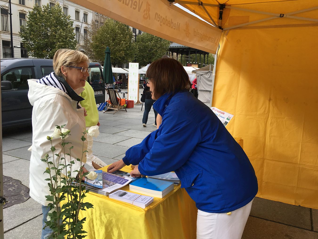 二零一七年九月十六日,在文化市场上,法轮功学员向广大民众传递着法轮大法的美好,传递着这来自东方的文化。