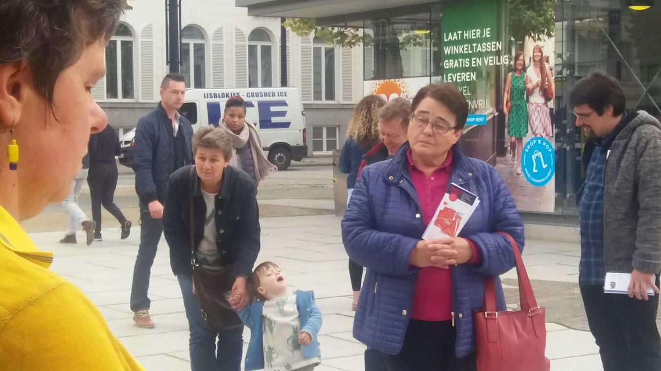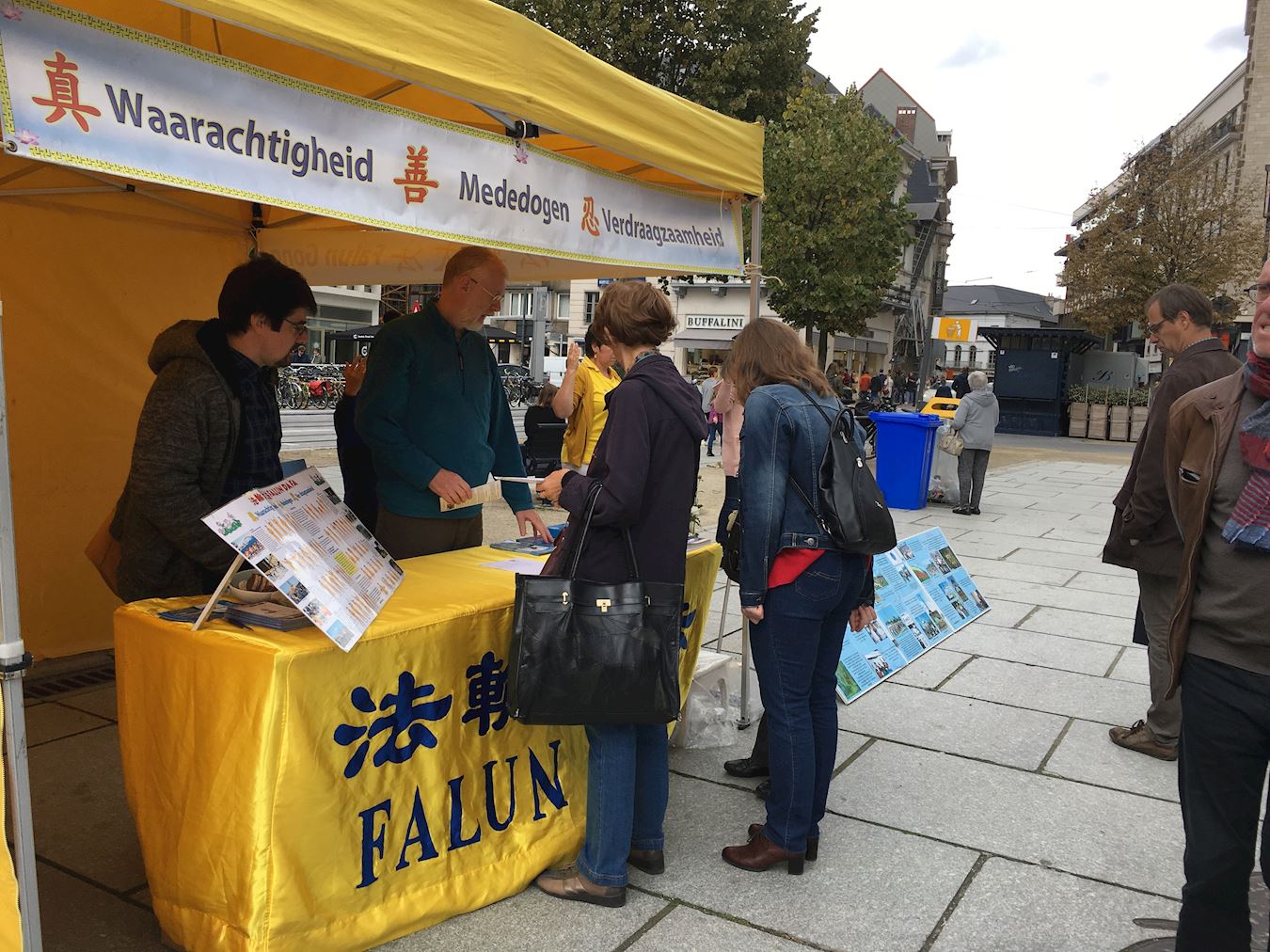 【明慧网二零一七年九月二十日】有“威尼斯水城”、“艺术才华的磁石”之称的比利时根特市(Ghent),被联合国教科文组织列为世界五个音乐之都的其中之一,每年吸引了大量的国内、国外爱好和欣赏艺术的人前来这里,享受这美丽、友好的音乐和文化盛会。“Odegand”是根特著名的音乐节,每年九月份的如期举行,同时间举行的文化市场也吸引了众多游客,在市中心的库尔德(Kouter)广场。广场周围大部份是十九世纪的建筑,有着浓郁的传统气息。和其它一百多个协会一起,法轮功修炼者也借机向这里的民众传播功法,并且向人们介绍有关法轮功的信息。