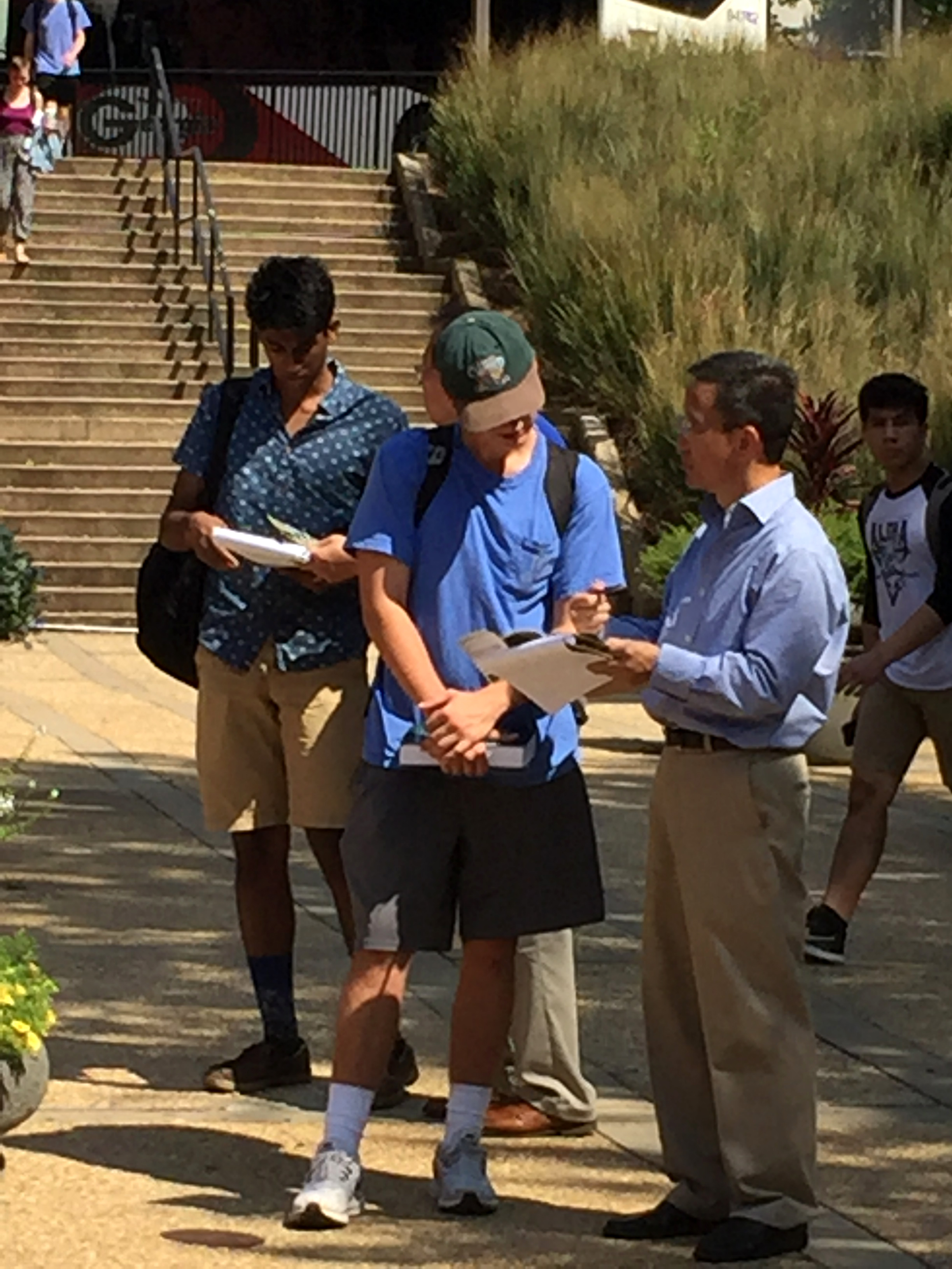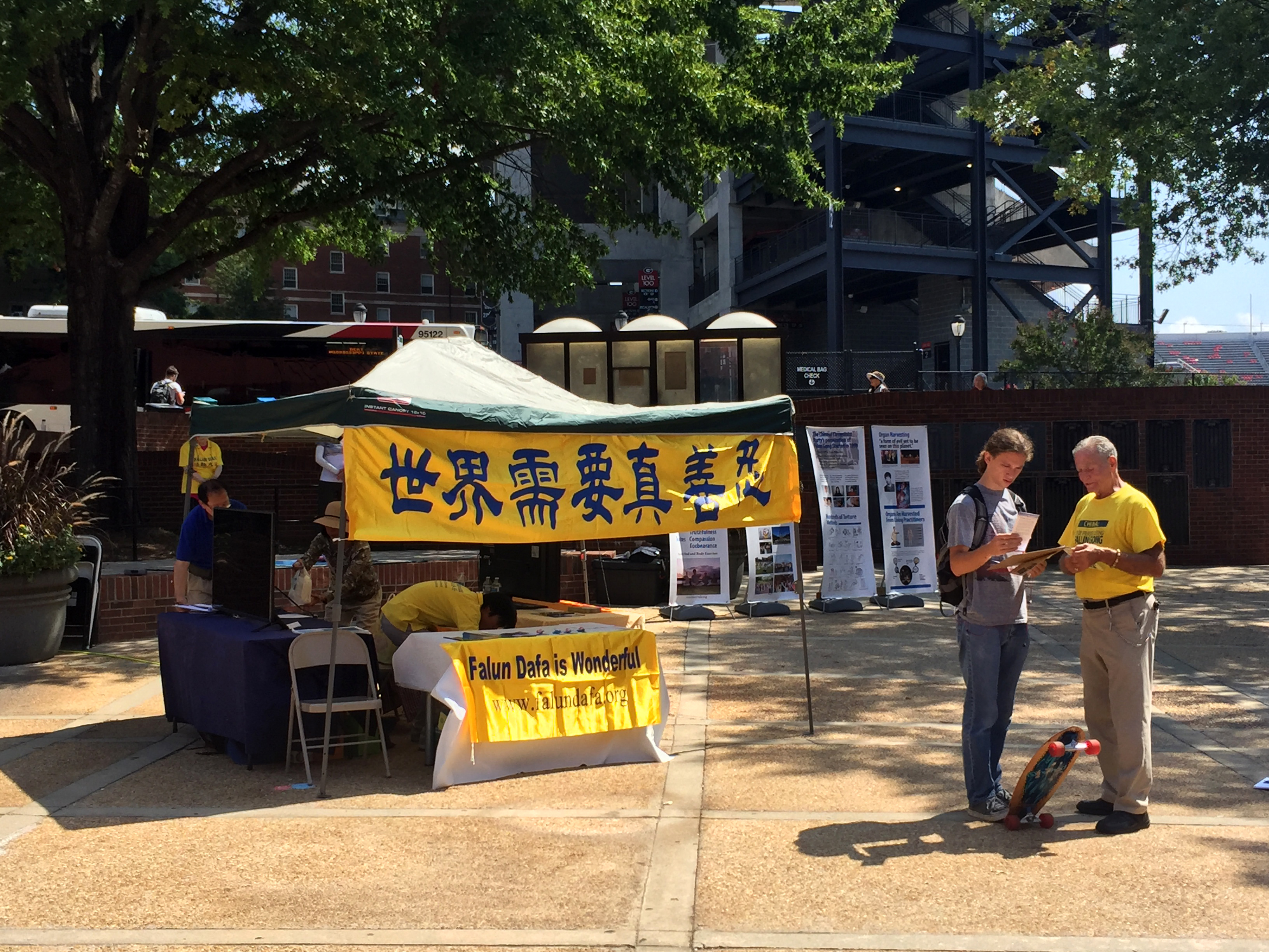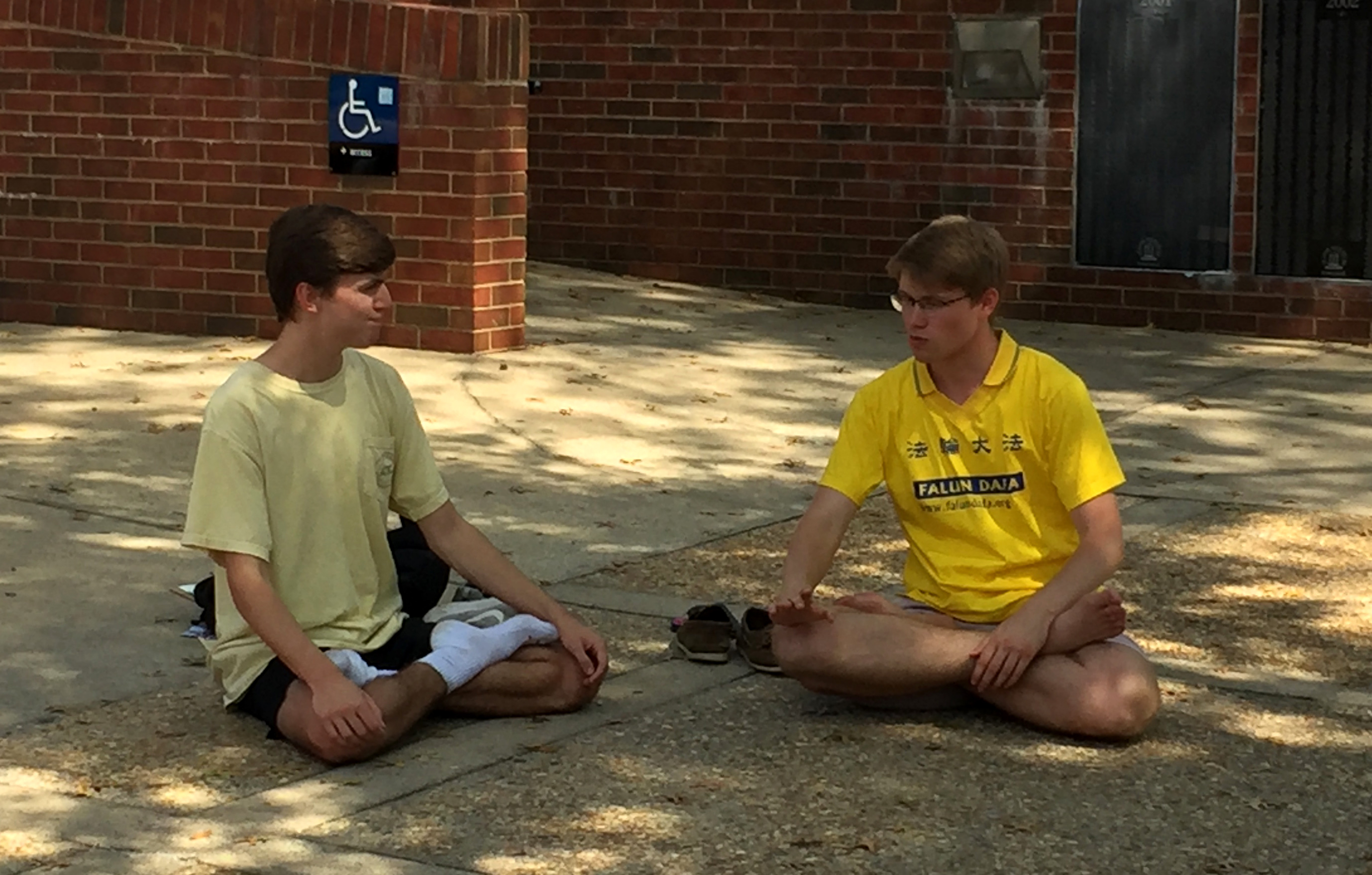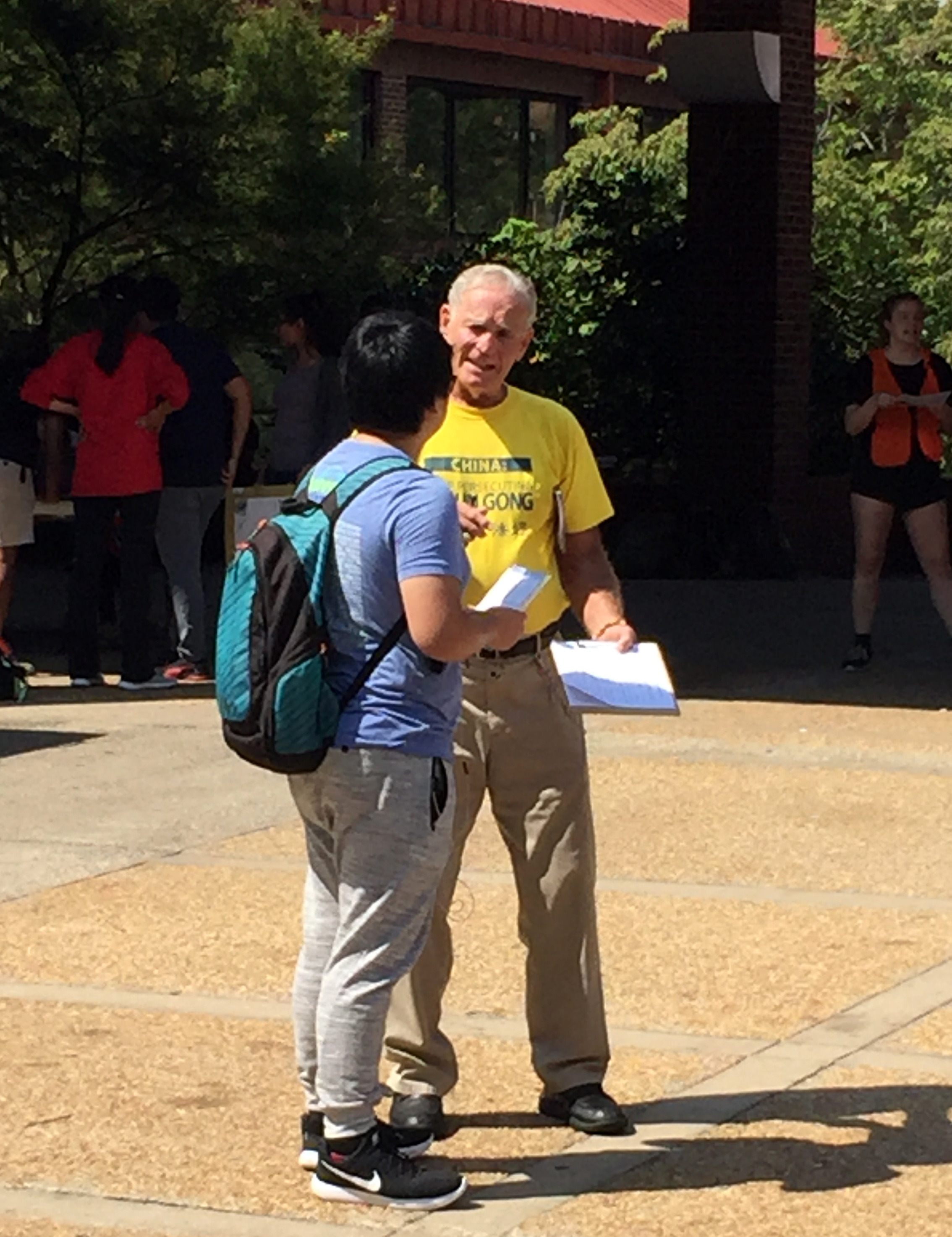 法轮功学员们在乔治亚大学校园中心地带的Tate学生活动中心前的广场,搭设了帐篷,竖立了展板,学员们有的在那里炼功,有的分发真相资料,有的徵集签名。法轮功亮丽优美的功法展示和触目惊心的展板,吸引了一批批的大学生和教师们。人们纷纷驻足,了解真相,签名支持,很多人当场盘腿打坐、开始学炼法轮功。