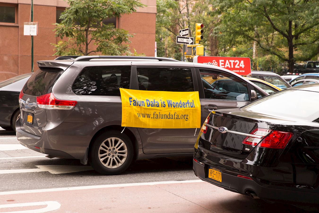 九月十九日和二十一日,川普车队两次经过二大道五十街的法轮功大型横幅前,两次学员们都看到总统川普先生向他们挥手致意。