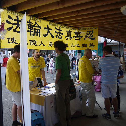 '图1~4:法国法轮功学员参加了法国边陲城市安纳西的别样生活展示会,介绍法轮功及其真相'
