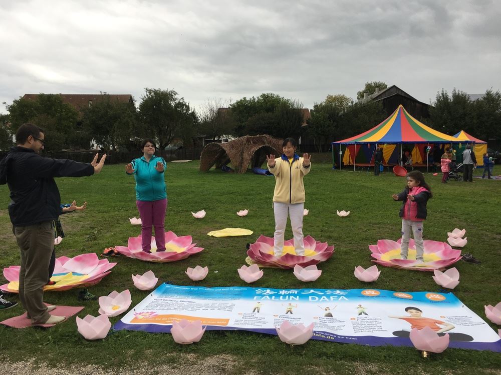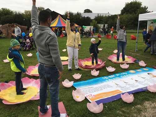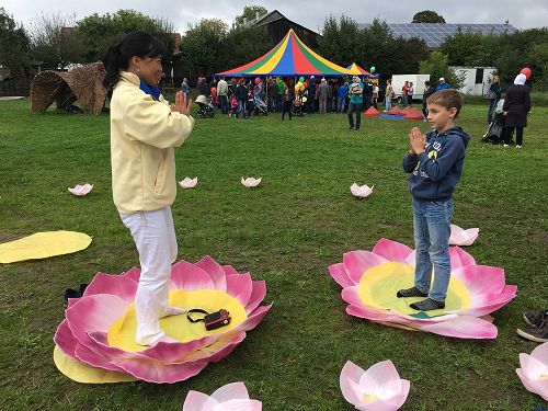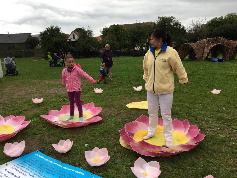 每次活动,法轮功展位前的人流总是络绎不绝,很多孩子和大人受到吸引,他们跟着法轮功学员学功,折莲花,学习描写三个中文字:“真、善、忍 ”,初步领会法轮功的修炼原则。