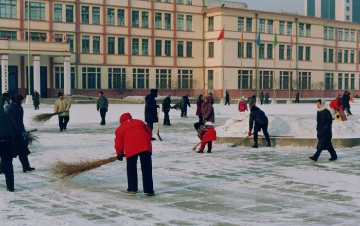 '图8:每逢下雪时,晨炼的学员都要把整个市政广场的雪打扫干净(一九九七年拍摄)'