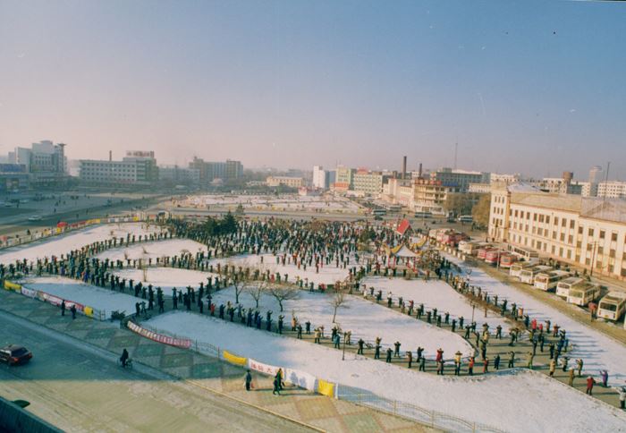 当年在政府广场还发生这样一件事情,在广场晨炼的法轮功学员,每次下雪,他们不仅清扫炼功场地的雪,而且还将偌大的政府广场的雪全部打扫干净。一天,市长值班,清晨起来,看见窗外有人扫雪,很奇怪,那年头还没有今天的扫雪机制,下雪了,就用广播喊各科室出人扫雪,很费劲,今天怎么了?他叫秘书出去看一下是什么人,当知道是法轮功时,市长很感动,亲自叫来新闻媒体现场采访,利用电视、广播、报纸充分赞扬。这张留下的珍贵的现场照片,见证了当年法轮功修炼者给人们留下的美好印象。