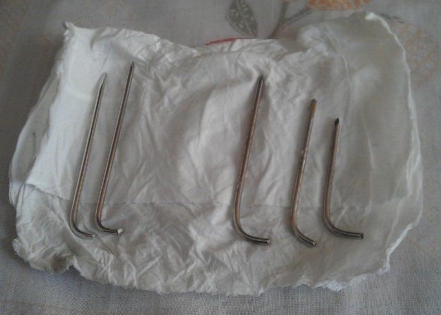 过了一个月,一天,我对脚的左面两个钉子说:“你们这一块儿進去的,你们还在里面干啥?出来吧!”我就求师父加持,发正念,让钉子出来。结果钉子打弯处都露出来了,我用手用力一别,两个钢钉先后都出来了。这里有先后出来的五个钉子的照片。
