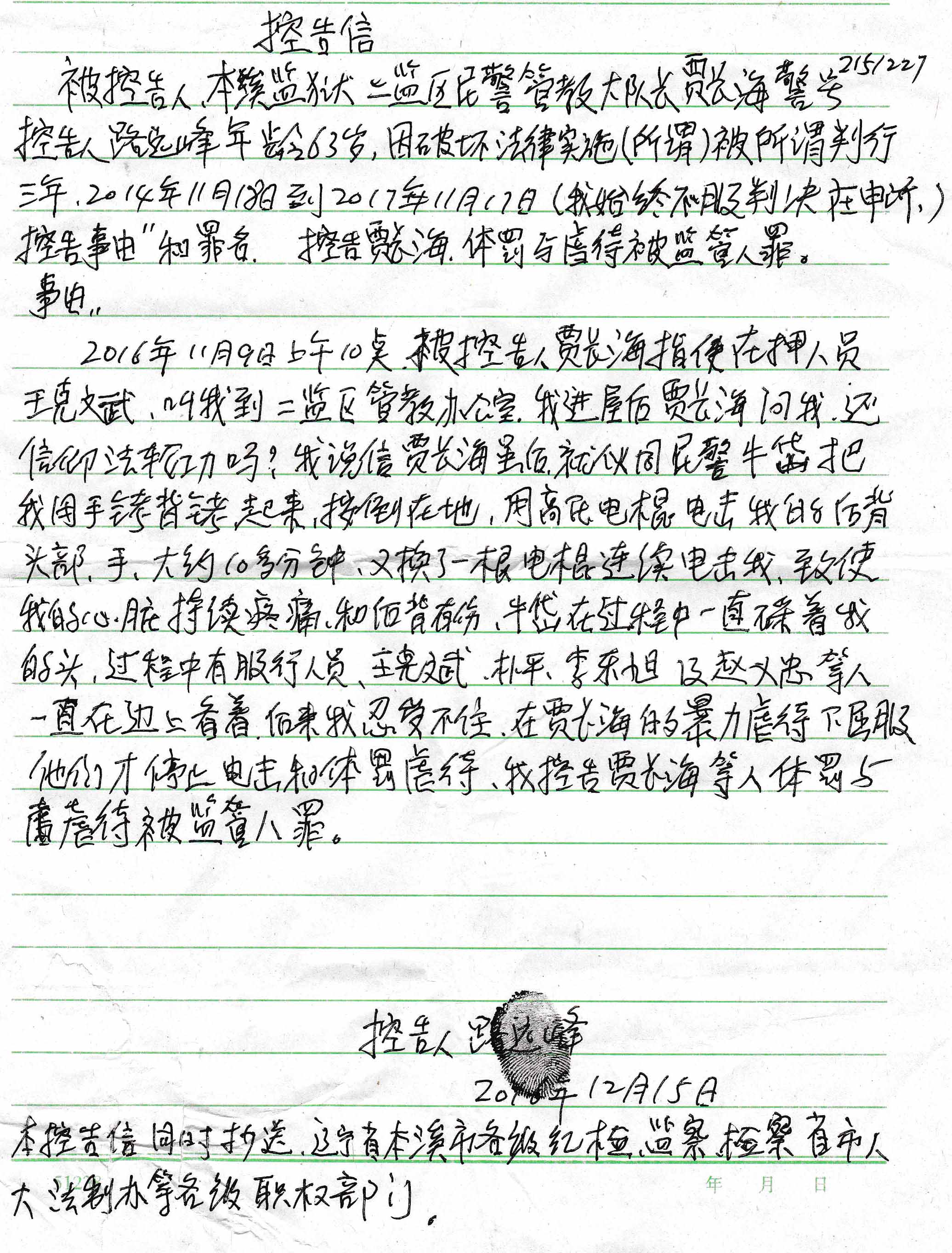 根据知情内部人士透露,当路远峰本人被狱警贾长海迫害后,亲笔写了控告信,交由正义人士带出。还有多位目击者、知情者的描述,本溪监狱二监区大队长贾长海,就是对路远峰实施“攻坚战”直接迫害、并指使他人迫害的主要凶手与责任人。符合中国大陆刑法第二百四十八条《体罚虐待监管人罪》的一切特征。为了达到逼迫路远峰放弃信仰的目的,贾长海用了多种手段极折磨路远峰,包括毒打、电击、冷冻等。贾长海曾接连把三根电棍都电没电了,持续电击路远峰,电的路远峰生不如死……