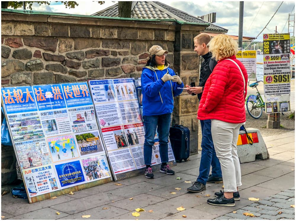 十月初的一天,一位瑞典中年男士来到展板前仔细观看、认真阅读,并主动和学员交流。他说,他常常跑步经过这里,觉得这个场特别祥和,今天他想过来多了解了解。原来他是一位酒店的厨师,他知道中国存在人权方面的问题,中共还在迫害法轮功,但感觉这些好象与他没什么关系,他也没想到会这么严重。