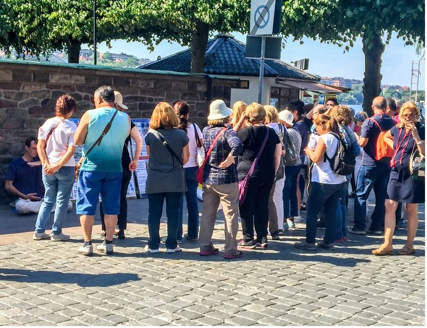 七月份的一天,正在休假的瑞典中年男士彼得(Peter)经过学员的活动场地时,得到了一张法轮功传单,看完后感觉非常好,于是他站在展板前认真阅读了全部的内容,和学员交流了很长的时间。