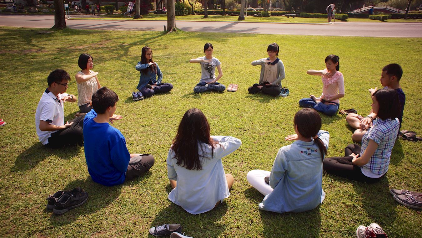 ![]() 图2:德仪(上排中)和青年同修们打坐炼功。 |