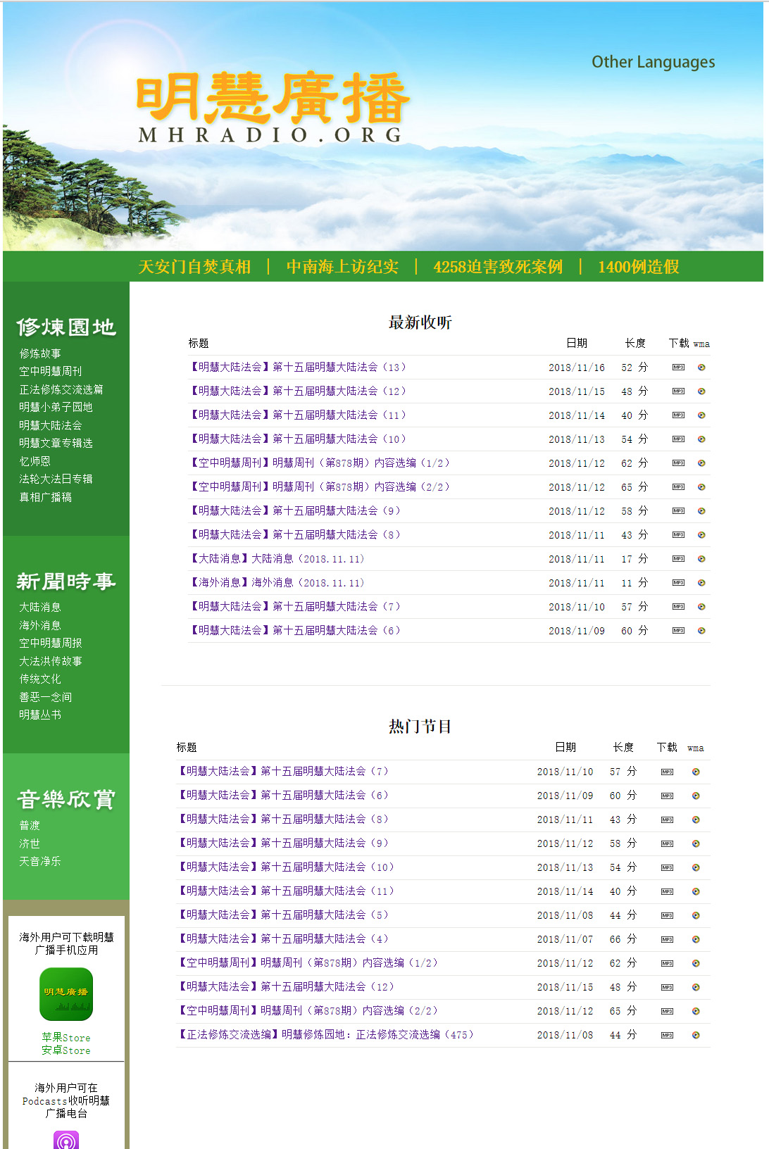 明慧广播网隶属于明慧网,目前有三个栏目:修炼园地、新闻时事、音乐欣赏。新的网页设计使这三个栏目更加清晰。基本真相也更加突出。