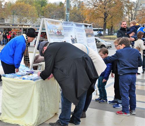 帕斯卡尔(Pascal)先生是一位律师,今天他和在政府部门工作的太太及三个孩子经过人权广场时,认真地看完展板上的信息后,夫妇在征签表上签了名。帕斯卡尔先生说:“我们刚刚看过资讯,才知道法轮功被迫害,这真是令人沮丧,难过,我祝愿他们勇敢地坚持下去。”他的妻子说:“我们全力支持他们”。