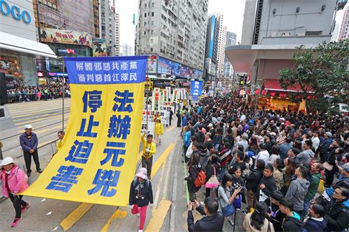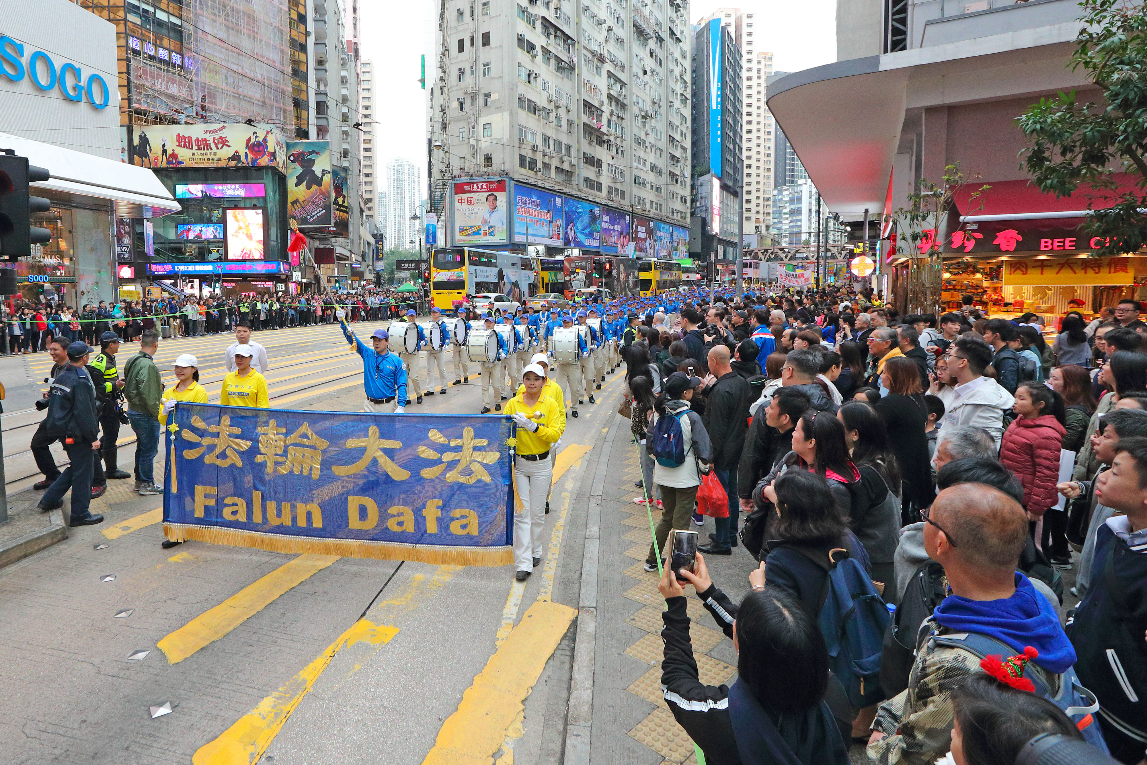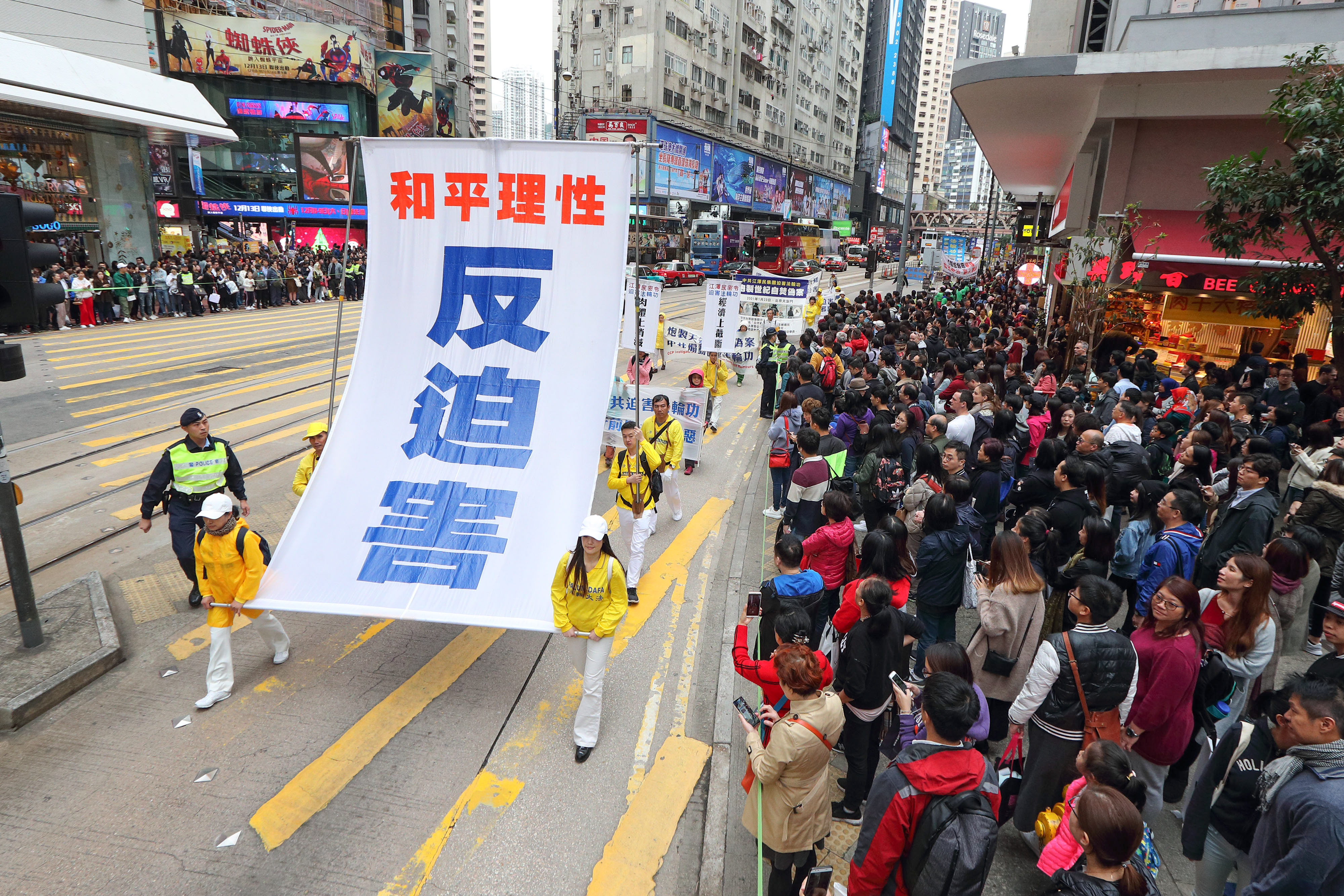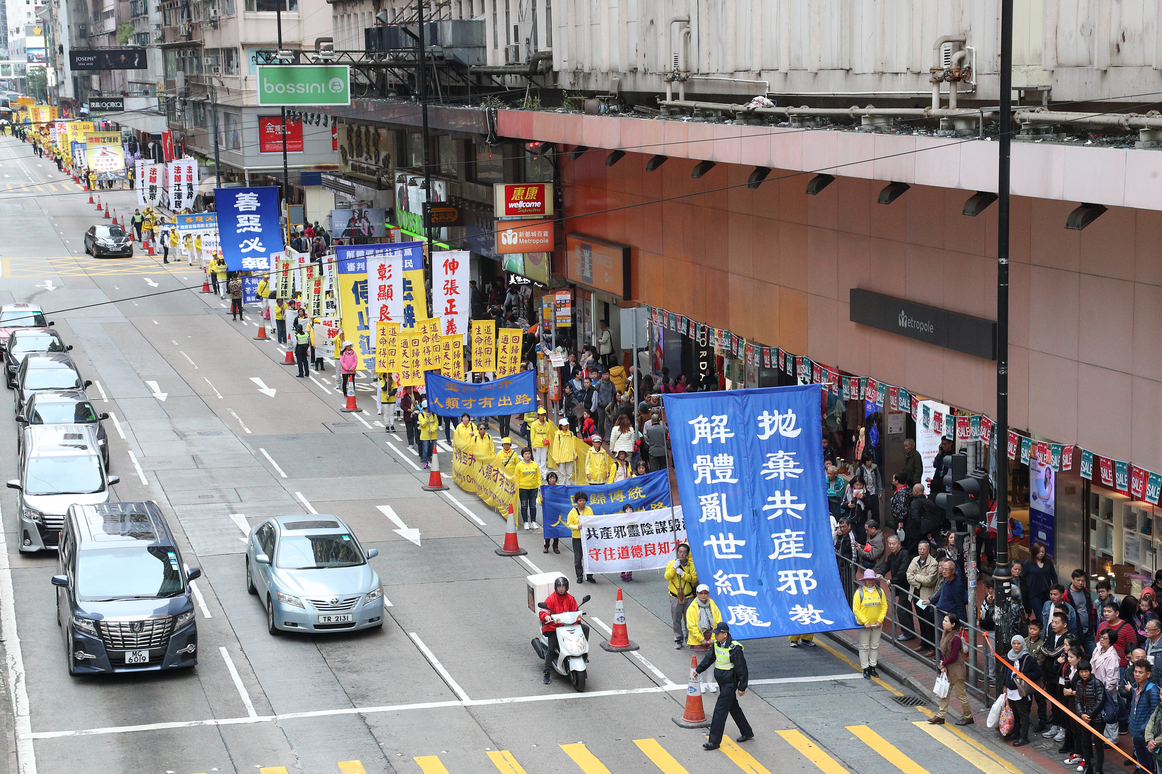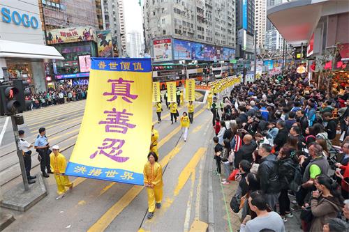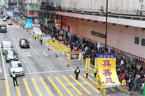 游行队伍分为“法轮大法洪传世界”、“和平理性反迫害”、“天灭中共 三退是福”、“惩凶除恶 复兴善良”、“了解真相 迈向光明”等几大方阵。“普世价值真善忍”、“停止迫害 法办元凶”等巨型横幅以及大小幡旗横幅,沿途吸引许多大陆游客及本地市民观看,不少人拿手机拍下游行的盛大场面。