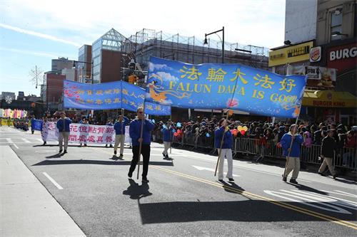 开道的天国乐团身着蓝白相间传统古装,以嘹亮的鼓乐送上了新年的祝福。他们沿途一直演奏,《法轮大法好》、《法鼓法号震十方》、《法正乾坤》、《送宝》、《法轮圣王》和《神圣的歌》等多首乐曲在法拉盛上空回荡,正气浩然。指挥周雯雯特别强调“我们准备了《凯旋进行曲》,希望大家在新的一年凡事都做得很顺利、成功。”