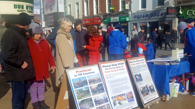 【明慧网二零一八年二月二十八日】二零一八年二月十七日,中国的大年初二,爱尔兰法轮功(又称法轮大法)学员来到都柏林市中心格拉夫顿大街顶端的广场,和当地民众一同庆祝中国新年,并向人们介绍中国传统文化和法轮大法。