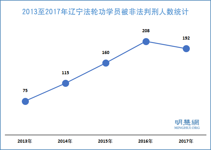 最新统计公布,二零一七年,中国大陆至少有1074名法轮功学员被中共非法判刑,其中辽宁占192名;二零一八年一至二月份,至少有123名法轮功学员被非法判刑,其中辽宁占14名。二零一七年至今,辽宁地区被中共非法判刑206名。据明慧网不完全统计,二零一三年至二零一八年二月的七年多的时间,辽宁地区非法判刑法轮功学员764名,其中,二零一三年判刑75名,二零一四年判刑115名,二零一五判刑160名,二零一六年判刑208名,二零一七年判刑192名,二零一八年一至二月判刑14人,居全国之首。