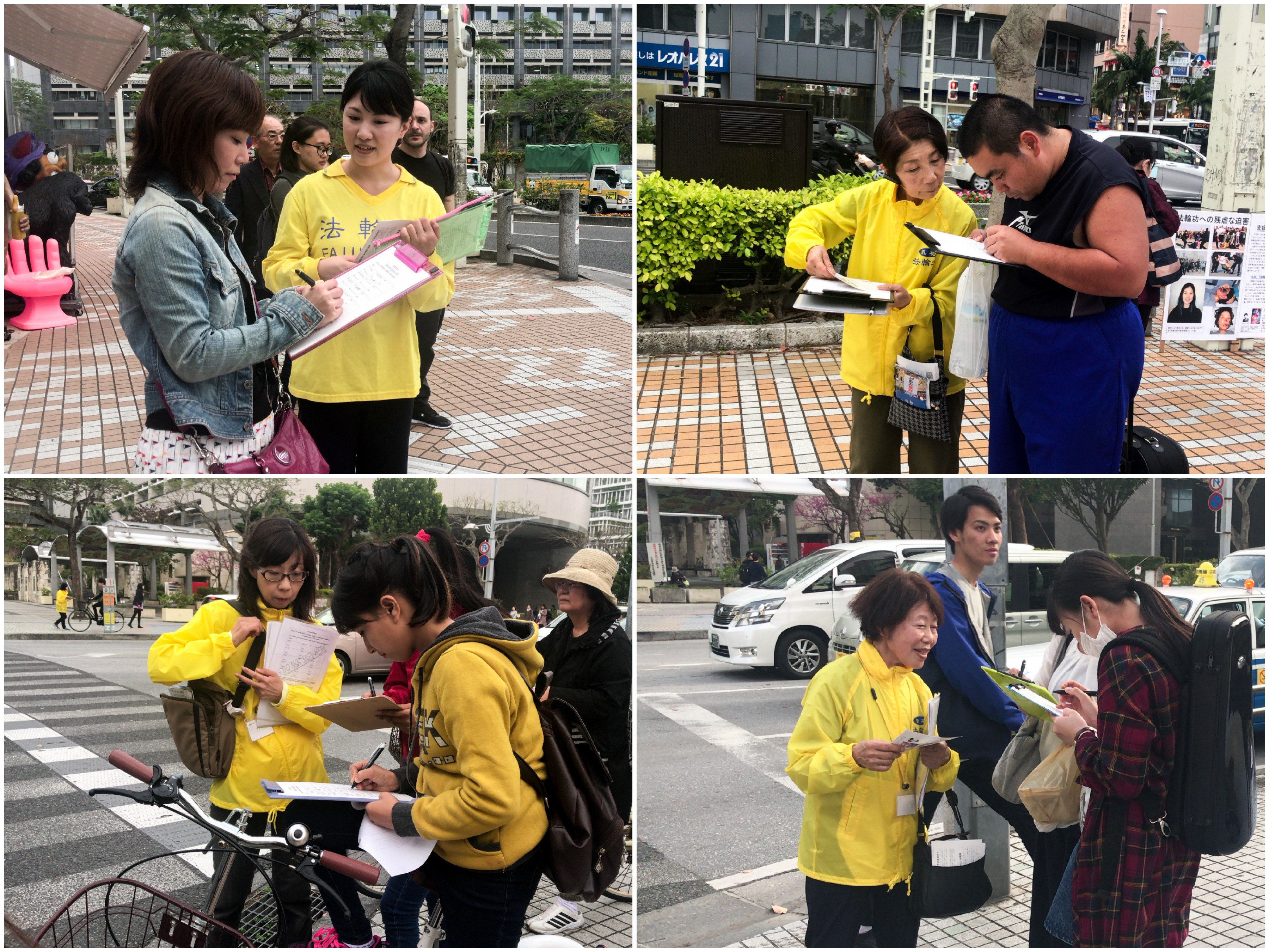 冲绳县富有独特的自然环境,气候温暖宜人,有“日本的夏威夷”之称,吸引众多海内外游客。因此,一年四季涌入不息来自世界各地的旅游客。为了使有缘的海外旅游客了解法轮功被迫害的真相,学员们除了日文和中文之外,还准备了英文、越南文、尼泊尔文、韩文等多语种真相资料。特别是学员们打开横幅和使用扩音器向日本民众呼吁声援诉江联署不仅仅是对过路行人,连等信号灯的很多车辆司机和乘客也都能听得到响亮的真相说明。了解真相的很多民众主动接过真相资料,并毫不犹豫的签名支持诉江。