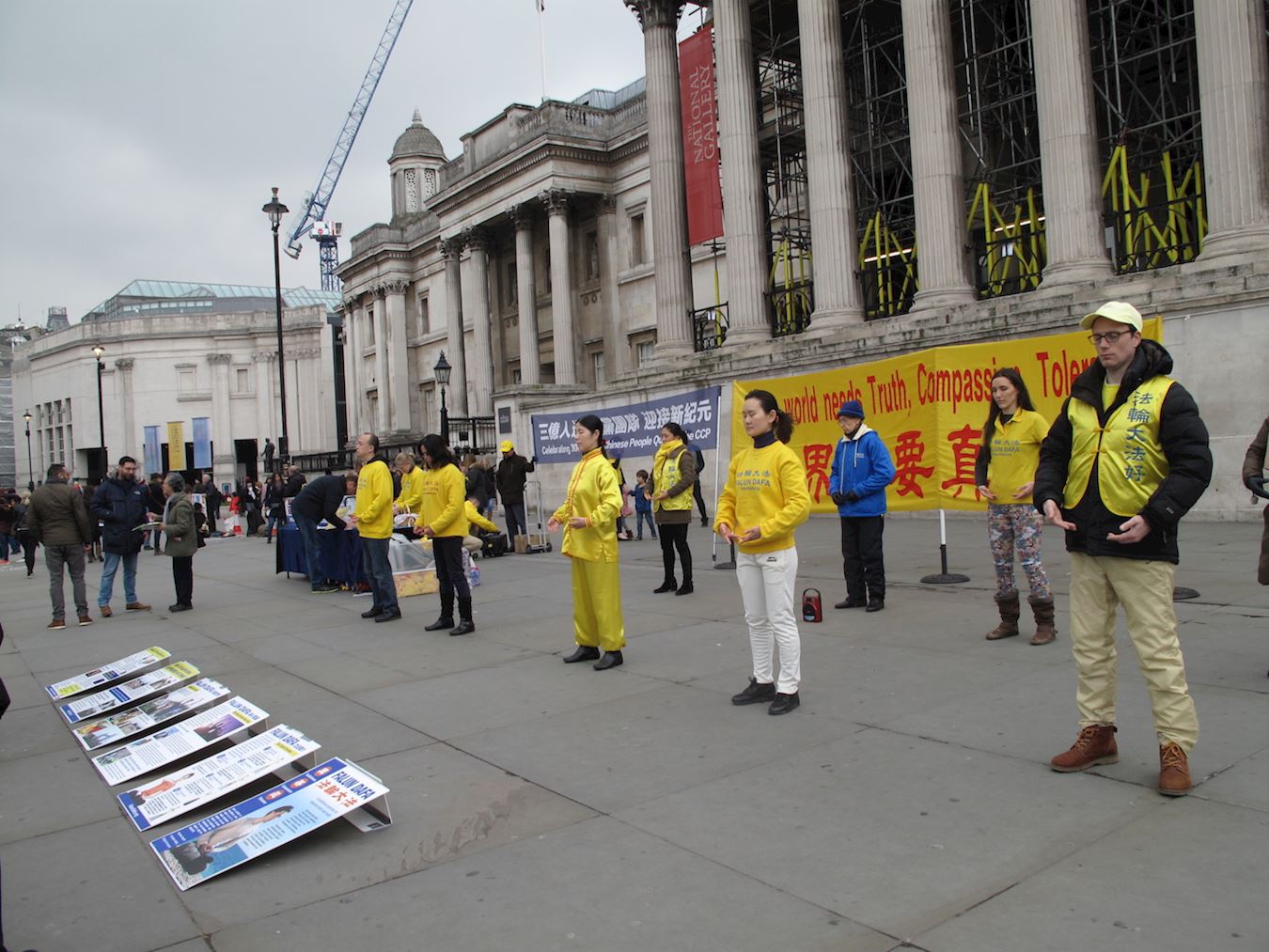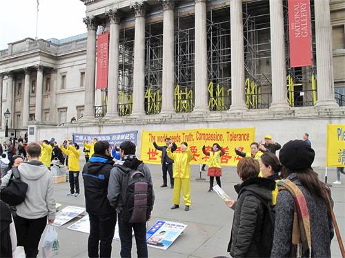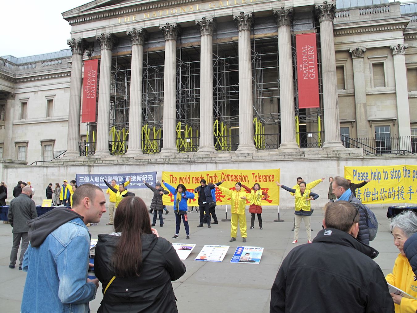 '图1~4:英国法轮功学员在伦敦特拉法加广场(鸽子广场)展示法轮功功法、讲真相和征签反迫害,庆祝三亿中国人退出中共'