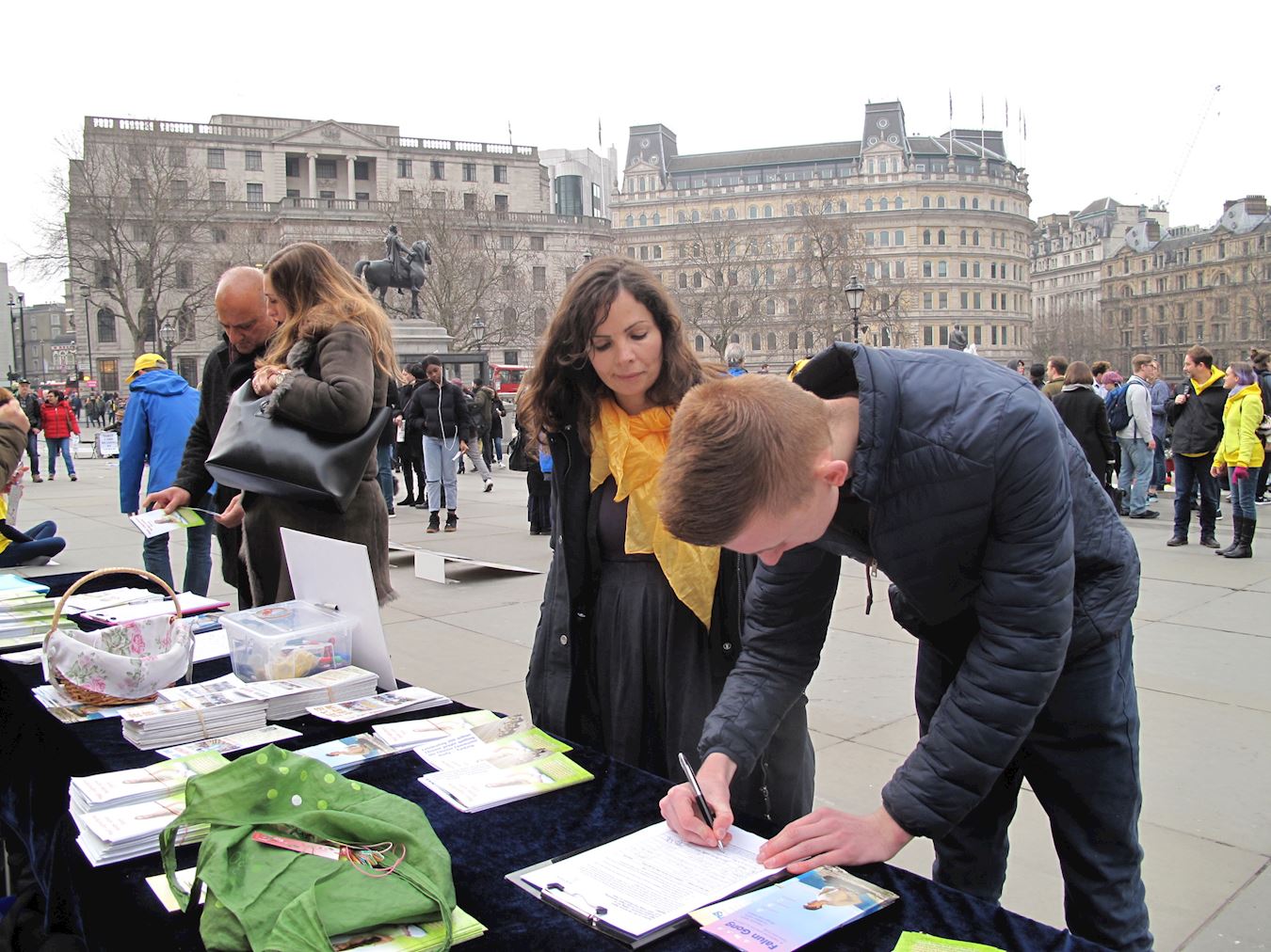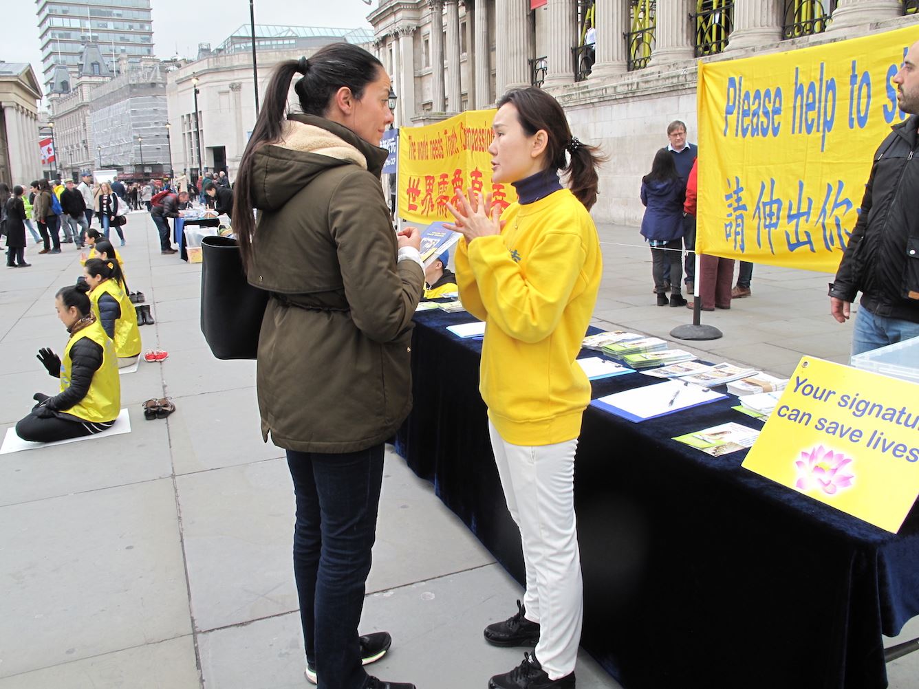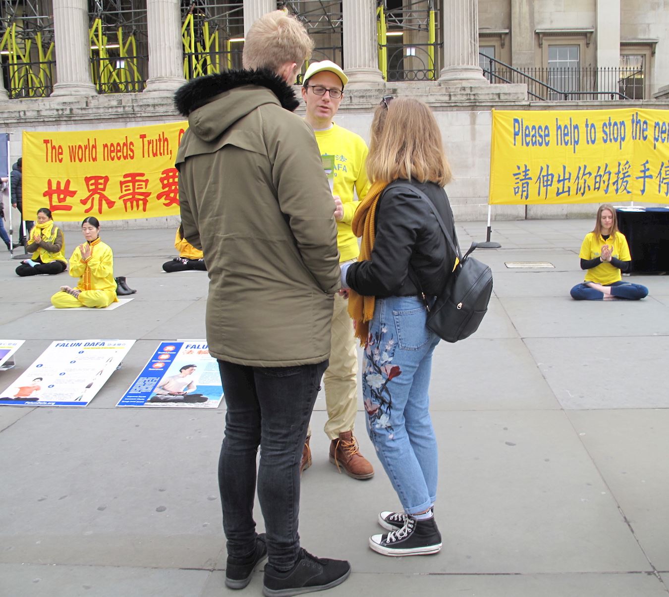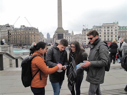 【明慧网二零一八年三月二十七日】二零一八年三月二十四日,英国法轮功学员在伦敦特拉法加广场(鸽子广场)开展讲真相活动,庆祝三亿中国人退出中共党、团、队组织的精神觉醒,向来自世界各地的游客传播法轮大法的美好,揭露中共的邪恶本质,呼吁国际社会携手解体中共制止迫害,希望更多中国人明白真相。一些西人学员也参加了本次讲真相活动。