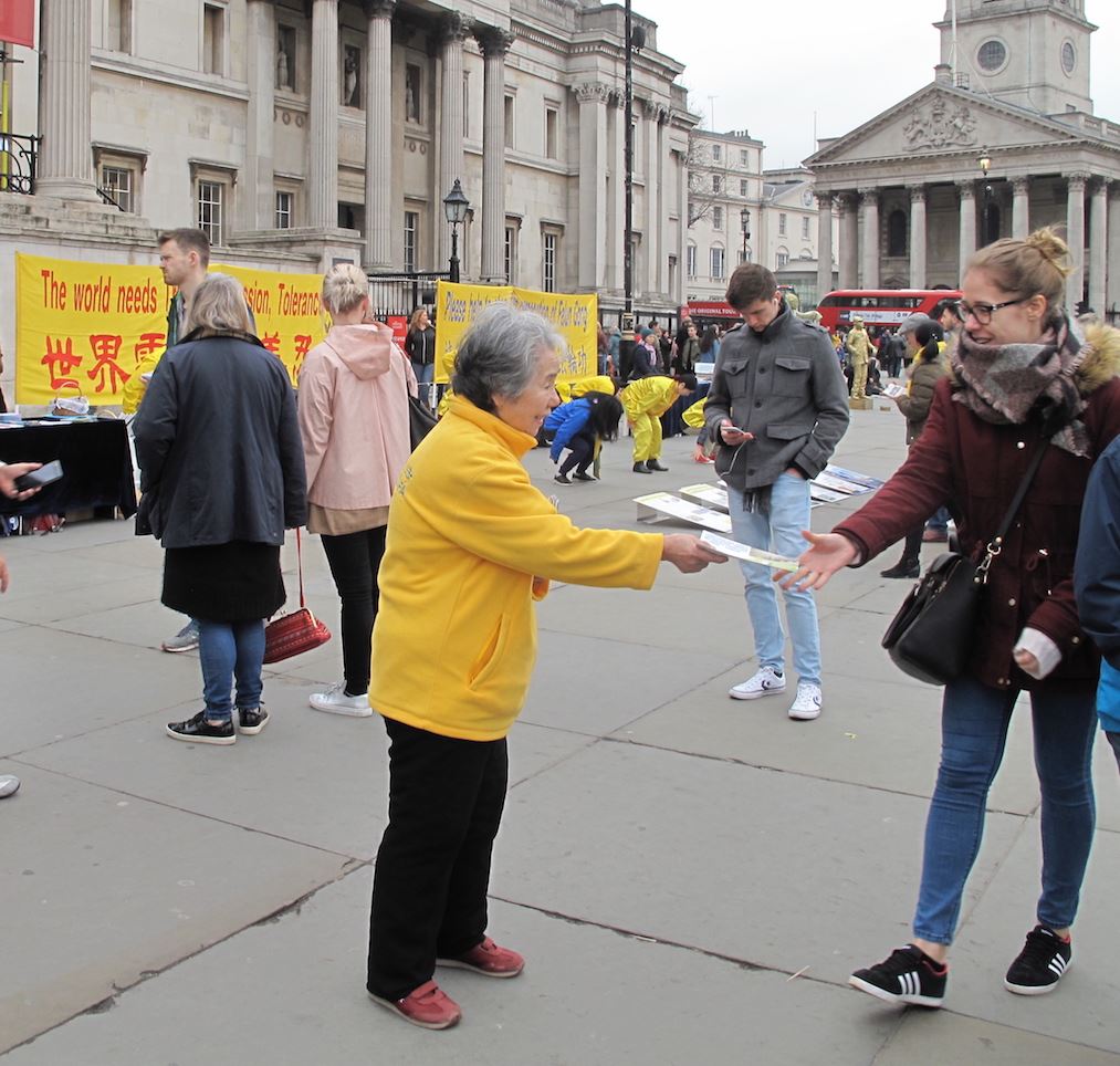 图1~4:英国法轮功学员在伦敦特拉法加广场(鸽子广场)展示法轮功功法、讲真相和征签反迫害,庆祝三亿中国人退出中共